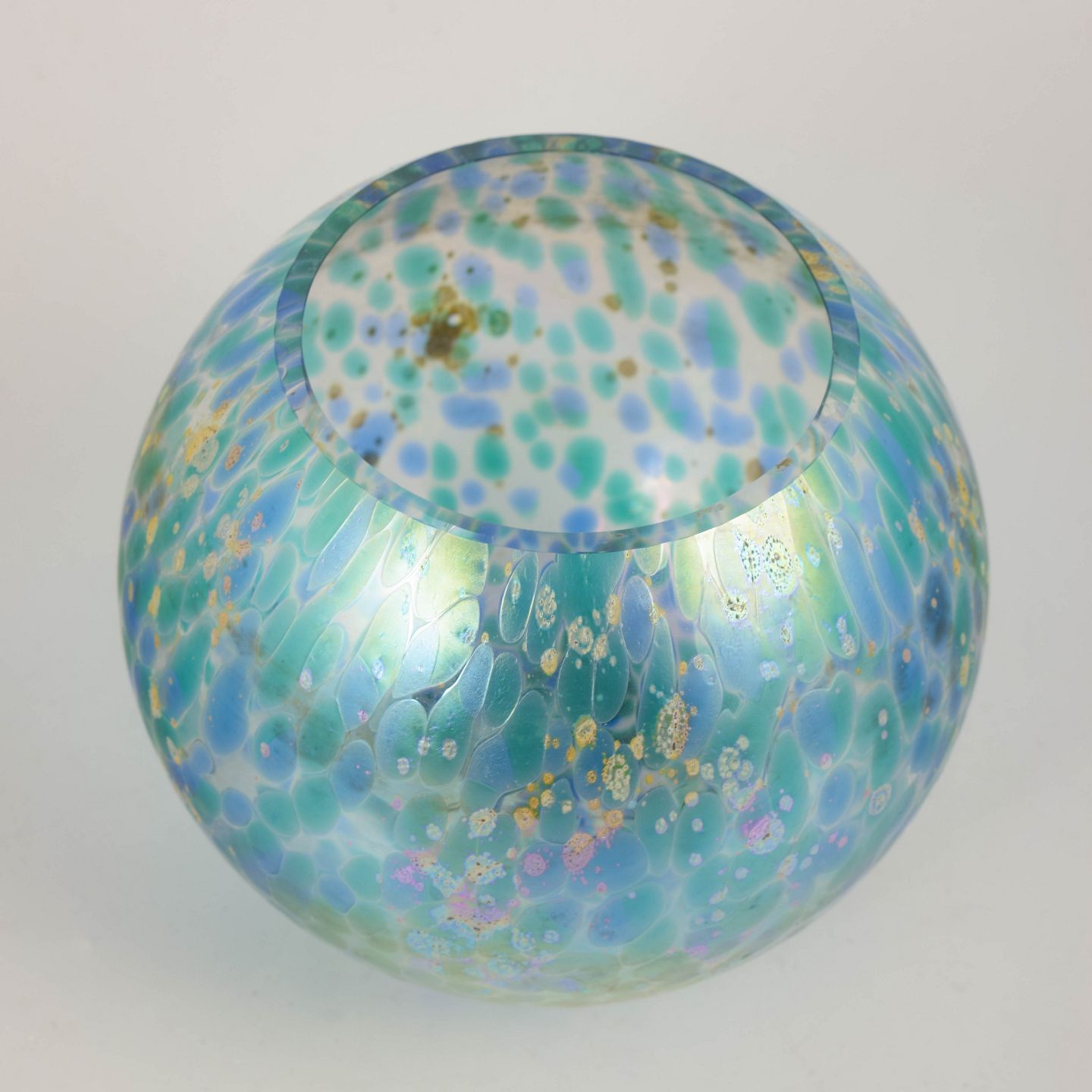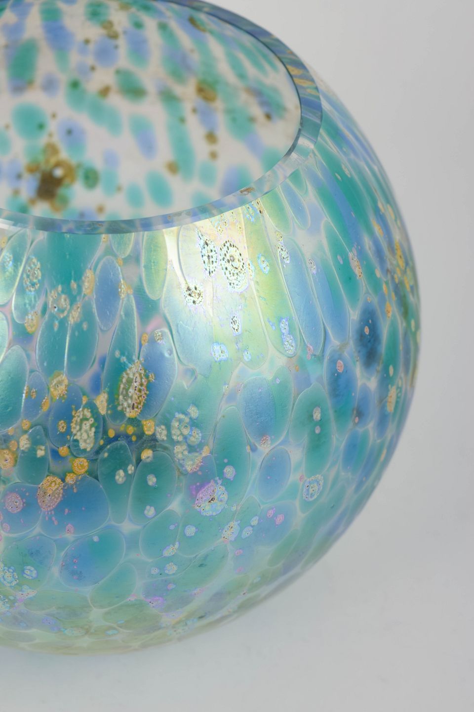 Lötz, Art Nouveau-vase.Kugleformet Art Nouveau-vase i iriserende kunstglas med turkisblå og grønne nuancer samt karakteristisk, cellelignende overfladedekoration med indslag af gyldne partier. Glassets levende farvespil og organiske struktur er typisk for Lötz’ eksperimenterende glasproduktion omkring år 1900. Modellen fremstår som et selvstændigt skulpturelt objekt, hvor form og overflade er tæt integreret.