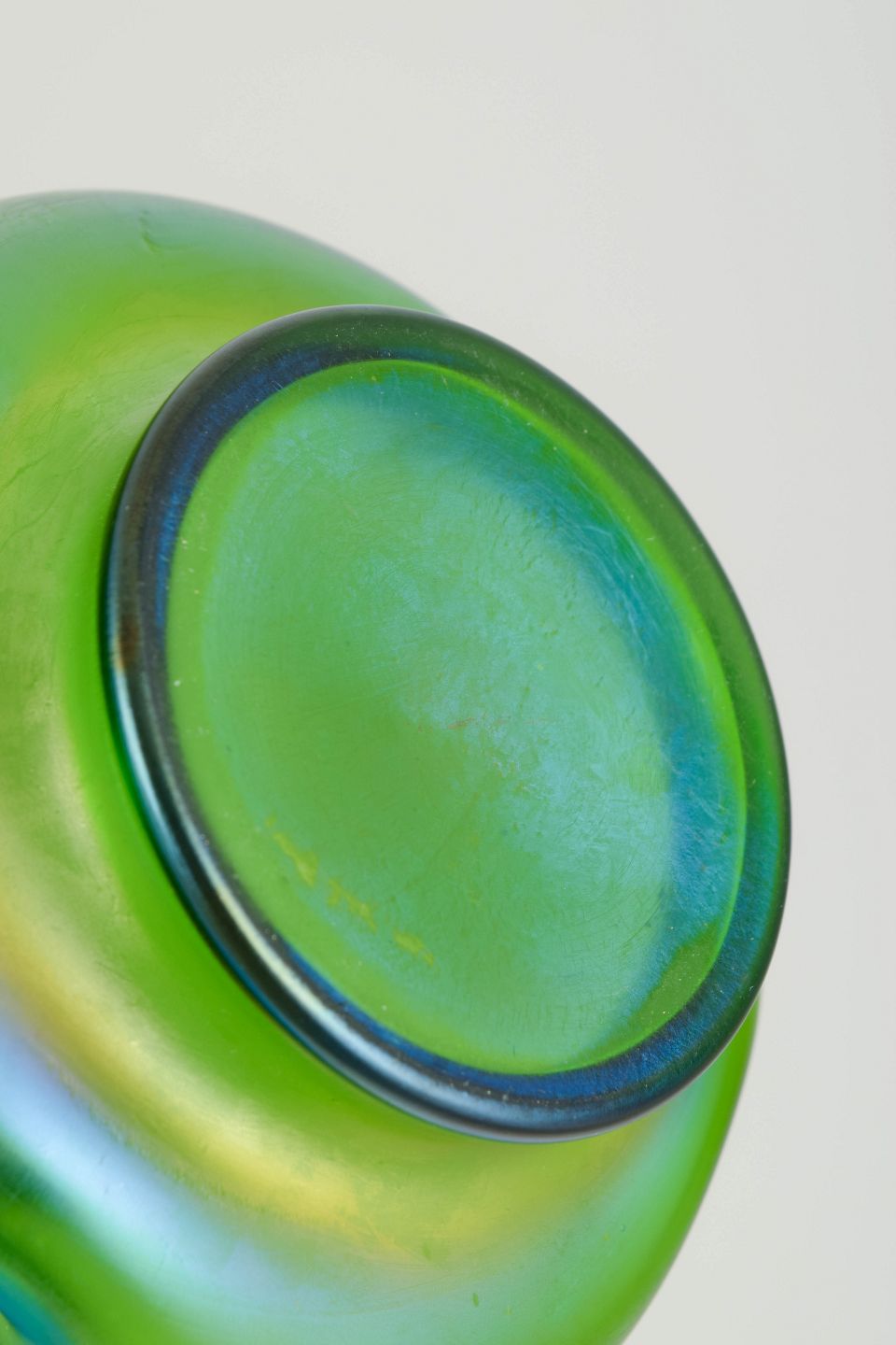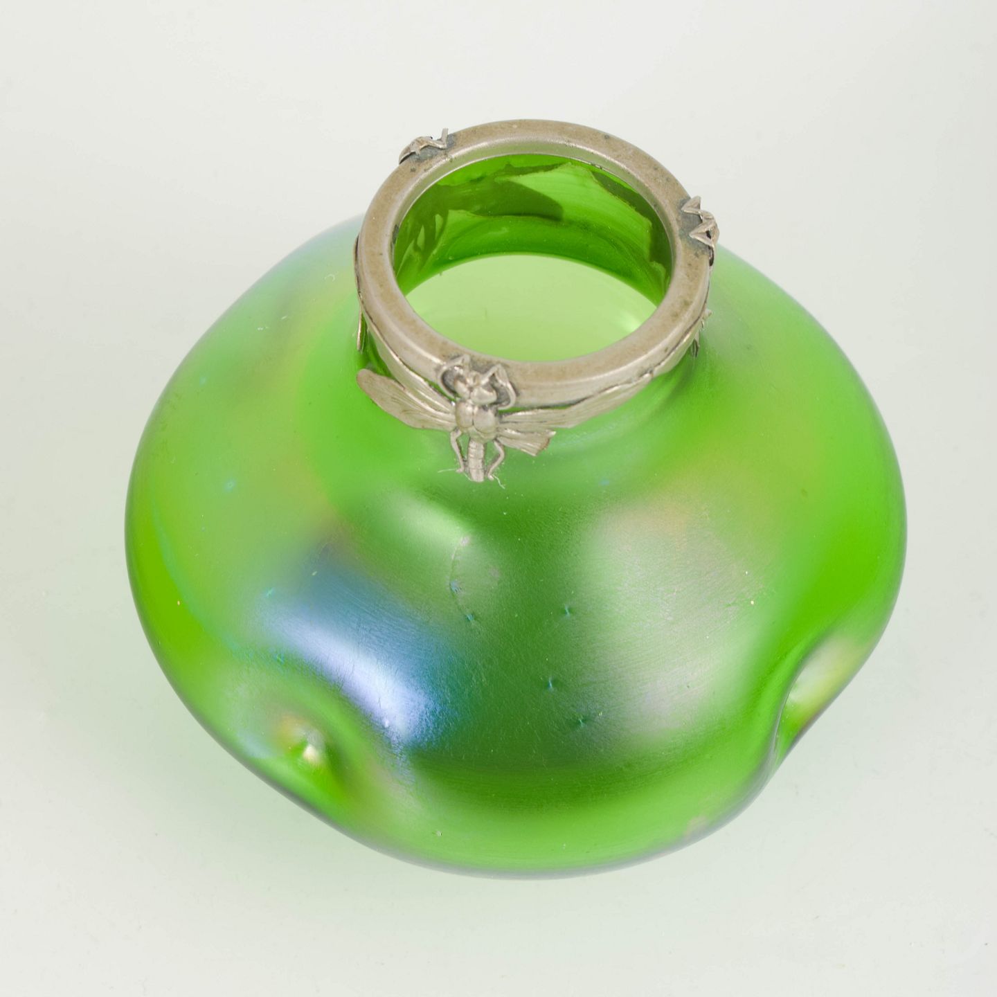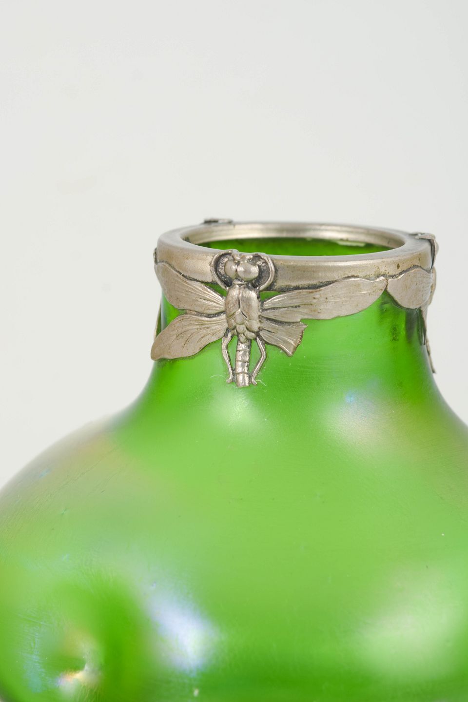Lötz, Art Nouveau-vase med tinmontering.Art Nouveau-vase i iriserende kunstglas med klar grøn grundtone og blødt afrundede, organiske former. Lav og bred bug med let indtrukket hals, afsluttet med dekorativ tinmontering udført i et stiliseret, naturinspireret motiv. Overfladen viser et diskret farvespil med blålige nuancer mod foden, karakteristisk for perioden.