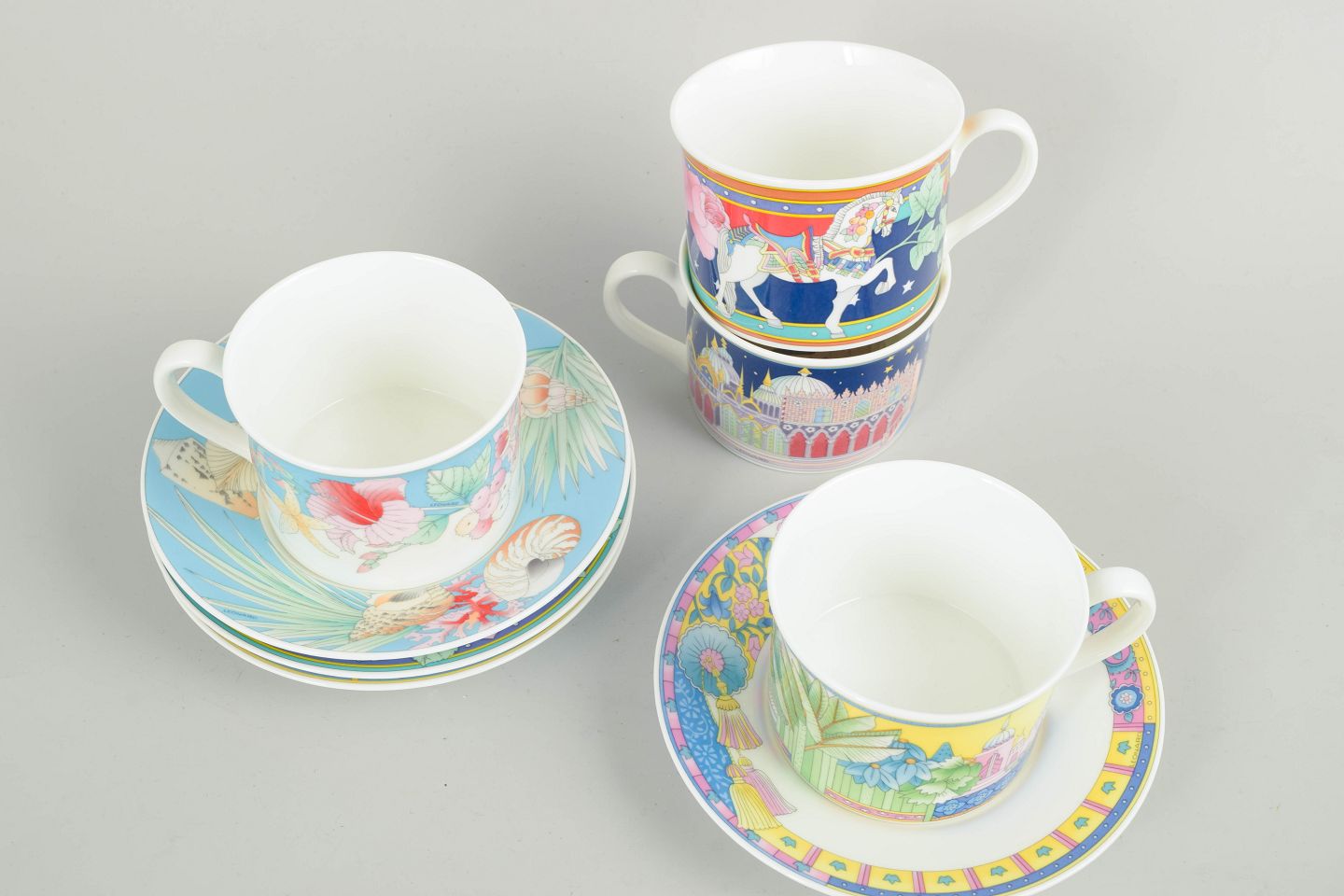 Hutschenreuther, sæt af 4 kopper med tilhørende underkopper.Elegant sæt i porcelæn med farverig, dekorativ dekoration. Harmoniske former med fin hvid glasur indvendigt samt detaljeret dekoration på koppernes yderside og underkopperne.