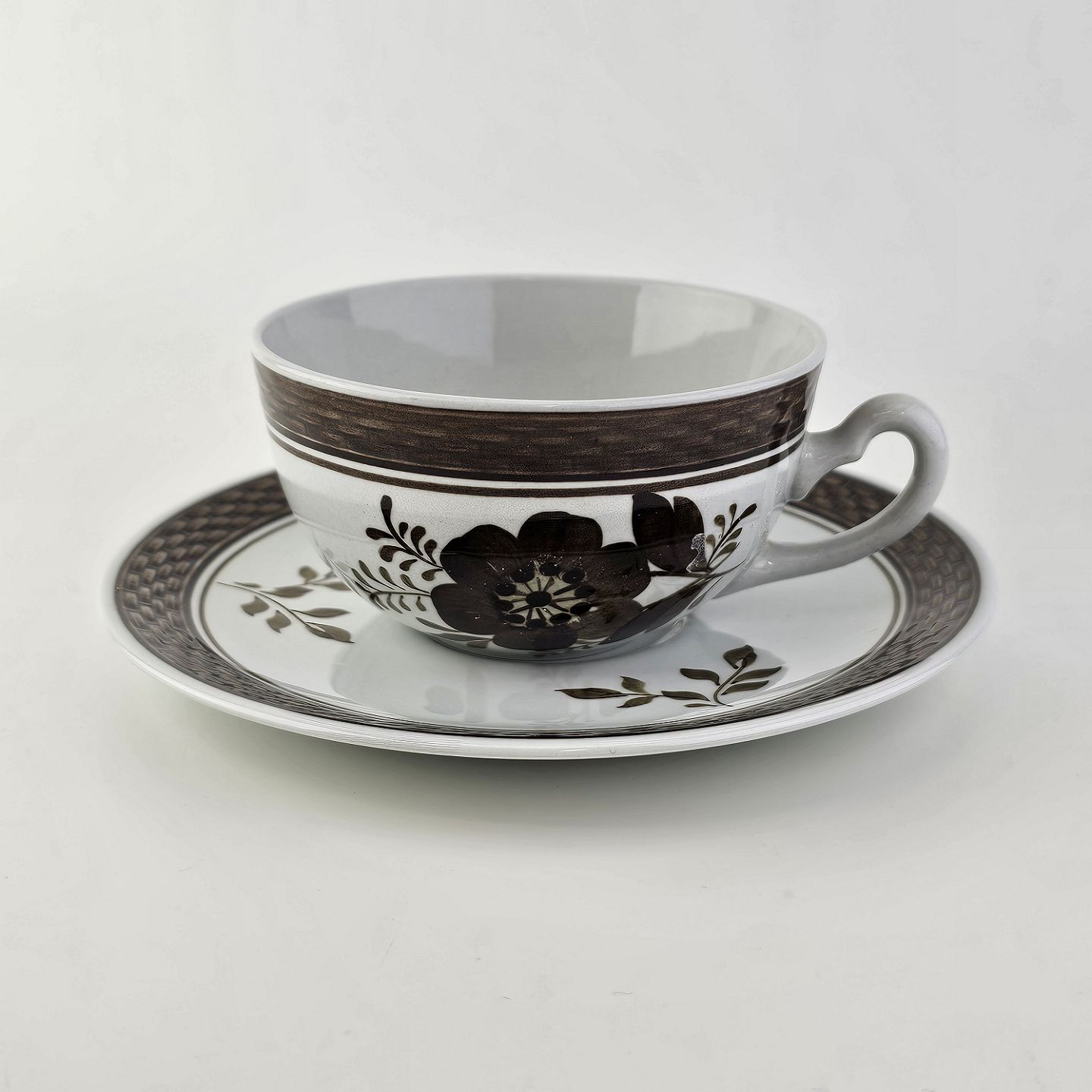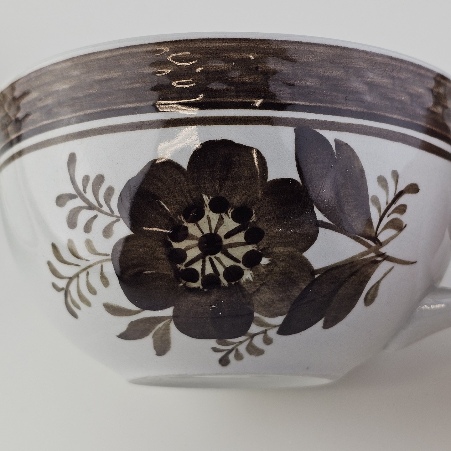 Fajancestellet med flettet kant og dekoration af brune blomster på lys baggrund med brun kant