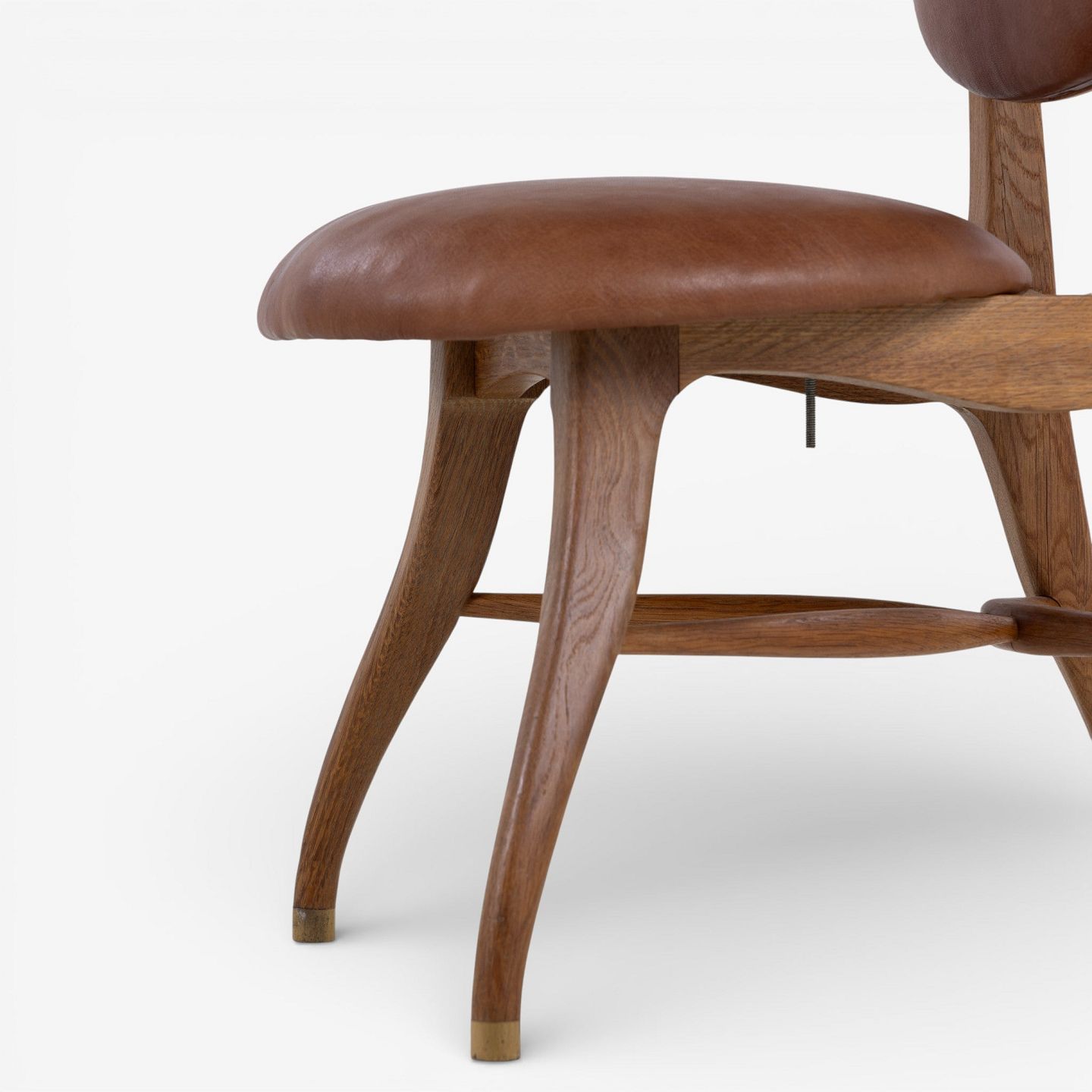 'Musikerstol' med stel i patineret egetræ og justerbart sæde og ryg i patineret nigerskind. Formgivet i 1942.