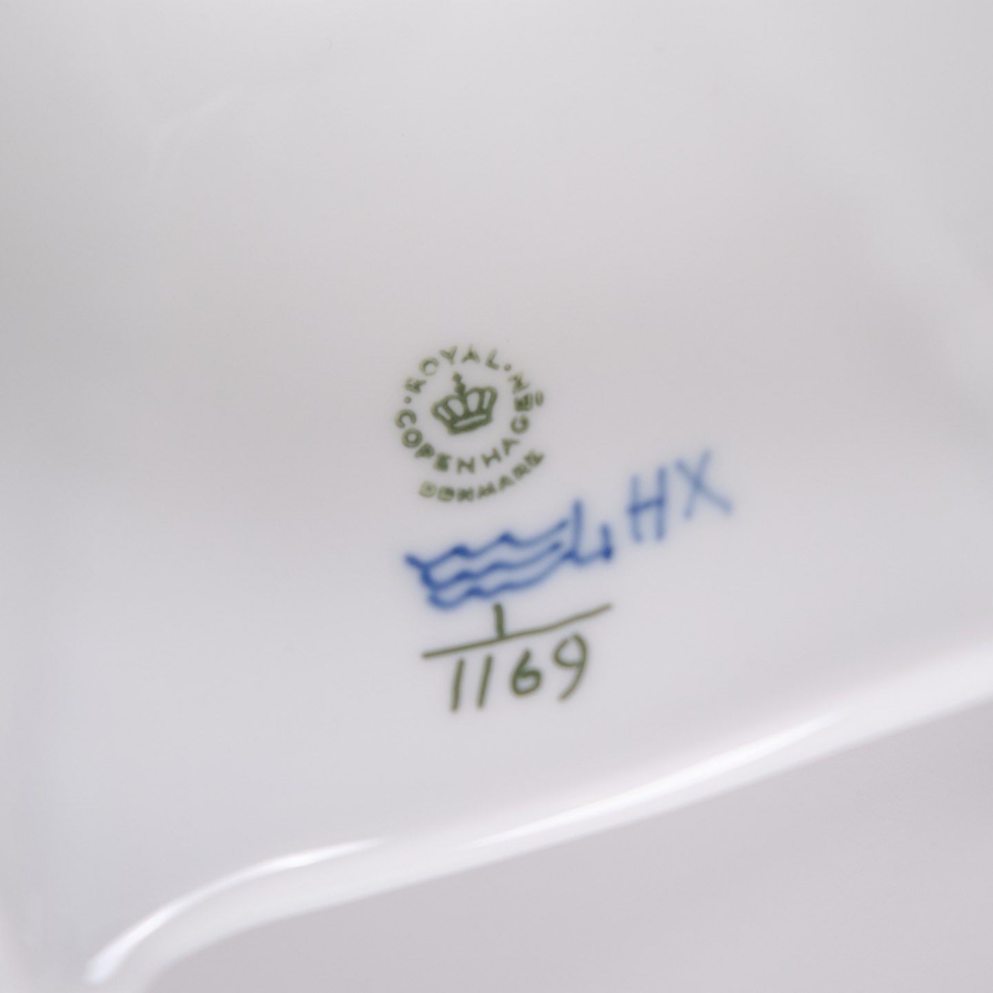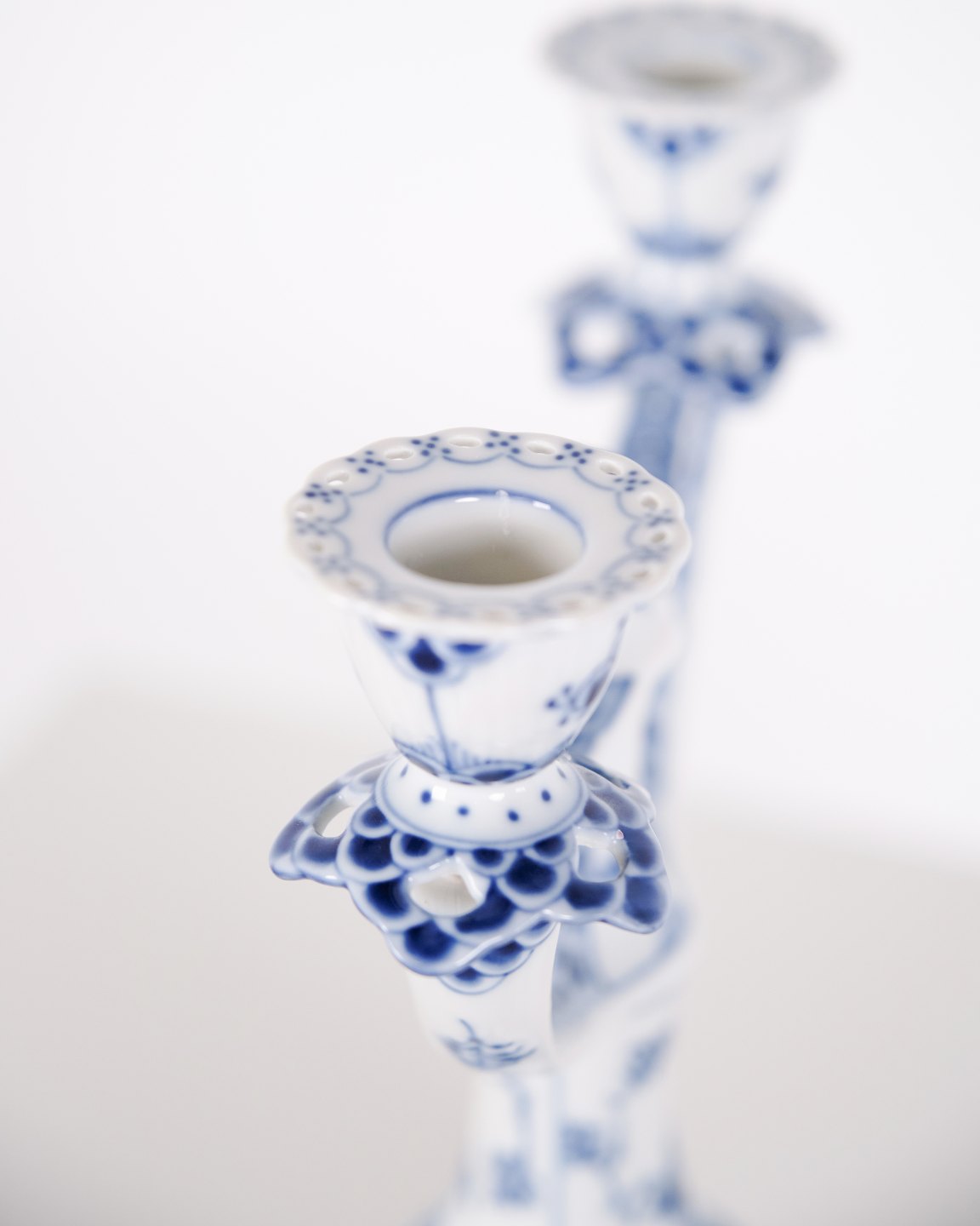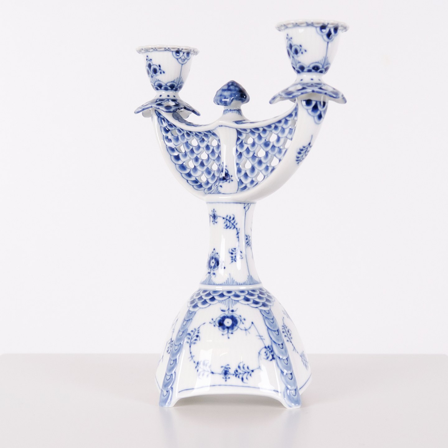 To-armet lysestage i musselmalet helblonde porcelæn, model 1169, produceret af Royal Copenhagen. Lysestagen er udført i håndmalet porcelæn med det klassiske helblonde-mønster, kendetegnet ved gennemgående gennembrudt bort og detaljeret underglasurdekoration. Modellen er produceret som 1. sortering og indgår i Royal Copenhagens traditionelle servicenproduktion.— Producent: Royal Copenhagen