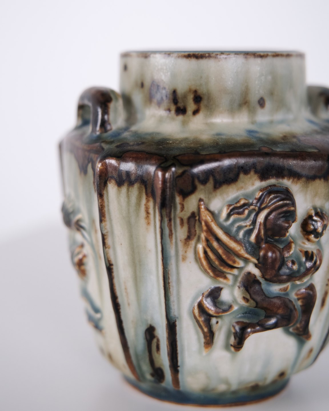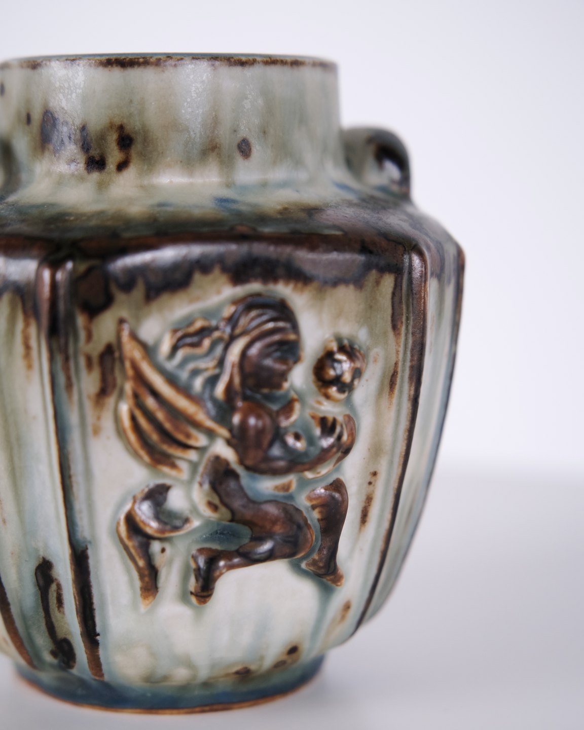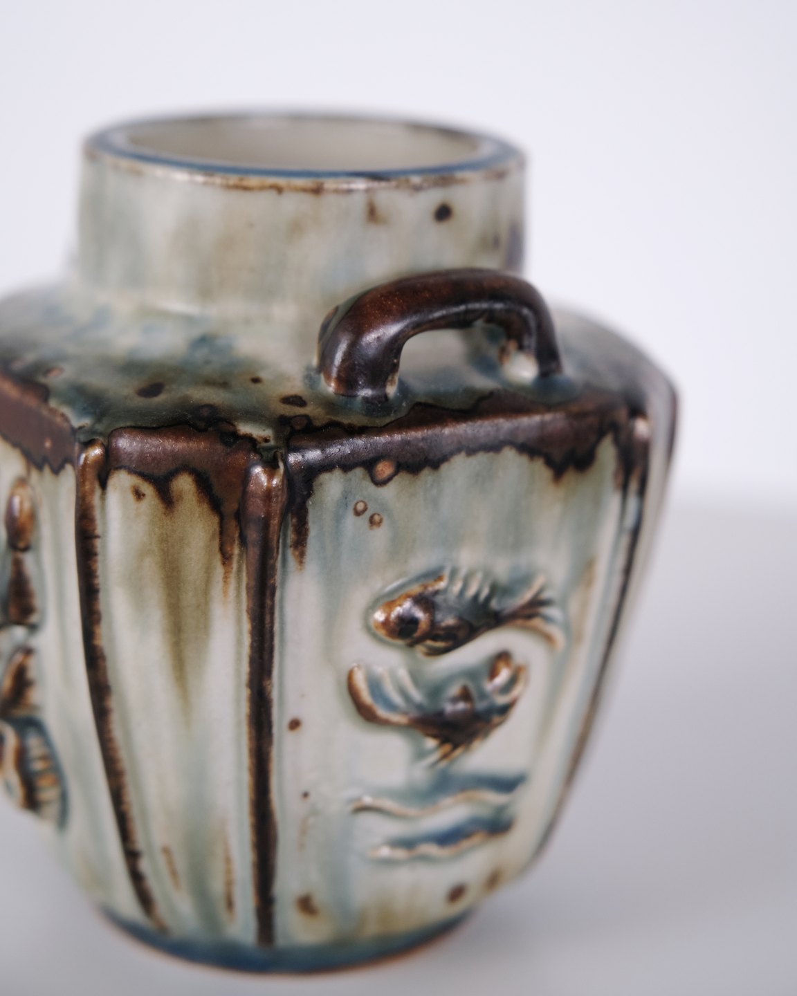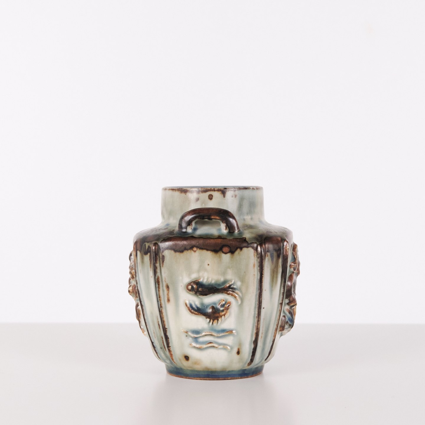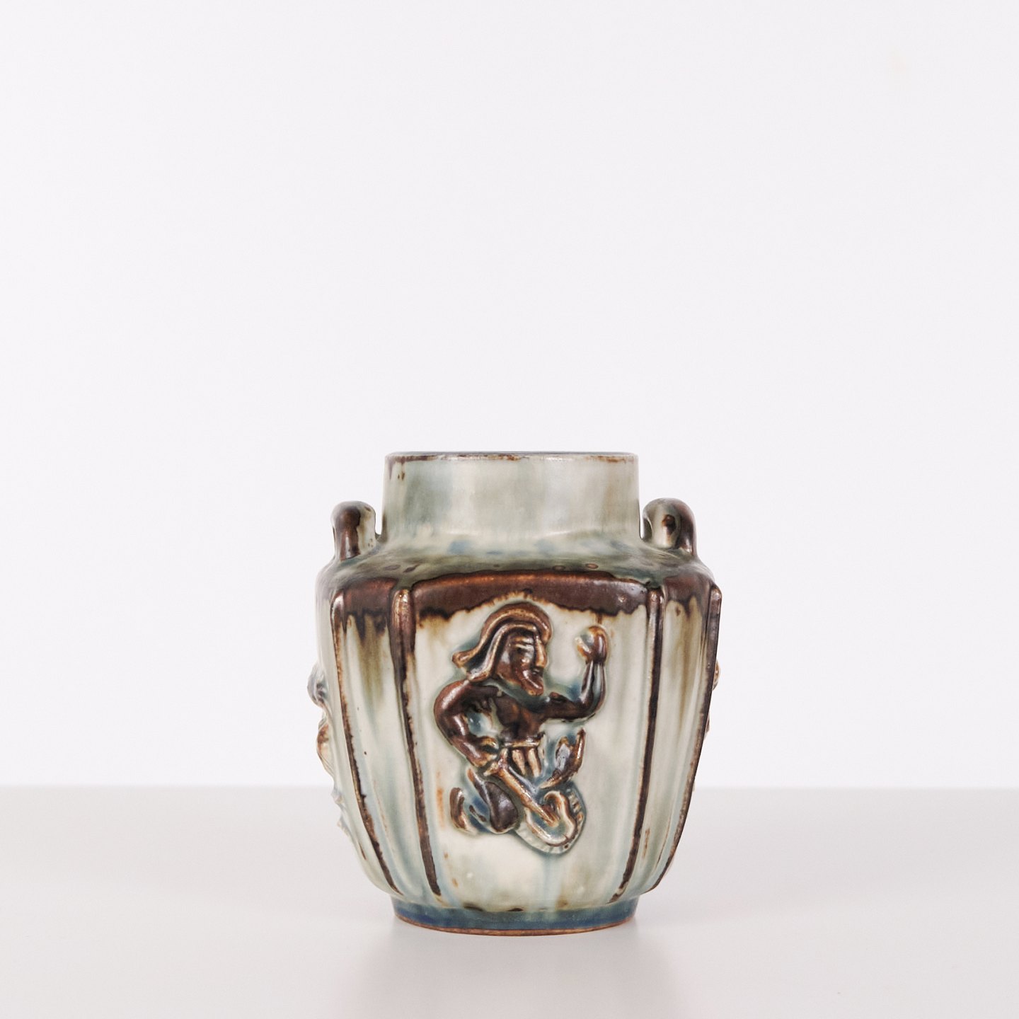 Stentøjsvase designet af Bode Willumsen for Royal Copenhagen. Vasen er modelleret i stentøj med reliefdekoration og produceret hos Royal Copenhagen i perioden 1969–1973. Modellen er kendt for sin plastiske overfladebehandling og tydelige håndværksmæssige udformning. Stemplet og signeret med monogram samt modelnummer 20121.— Designer: Bode Willumsen