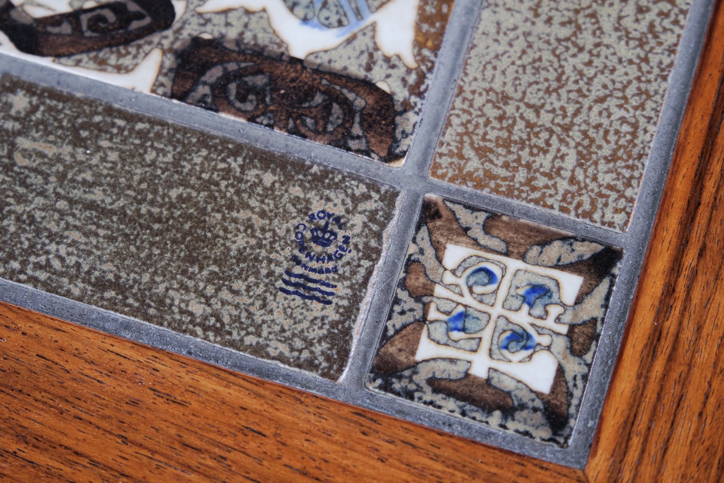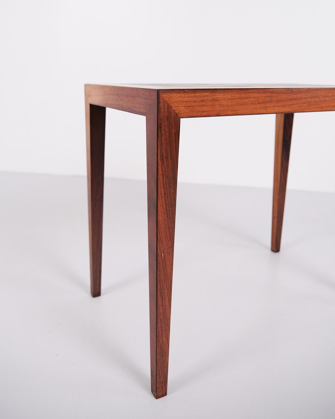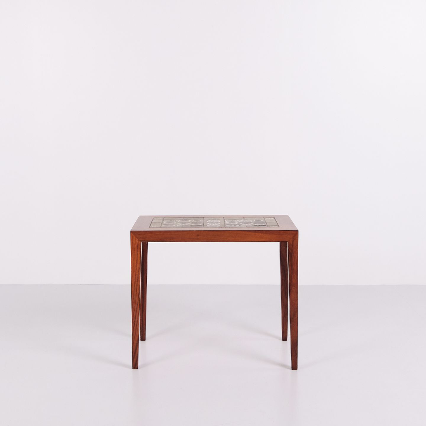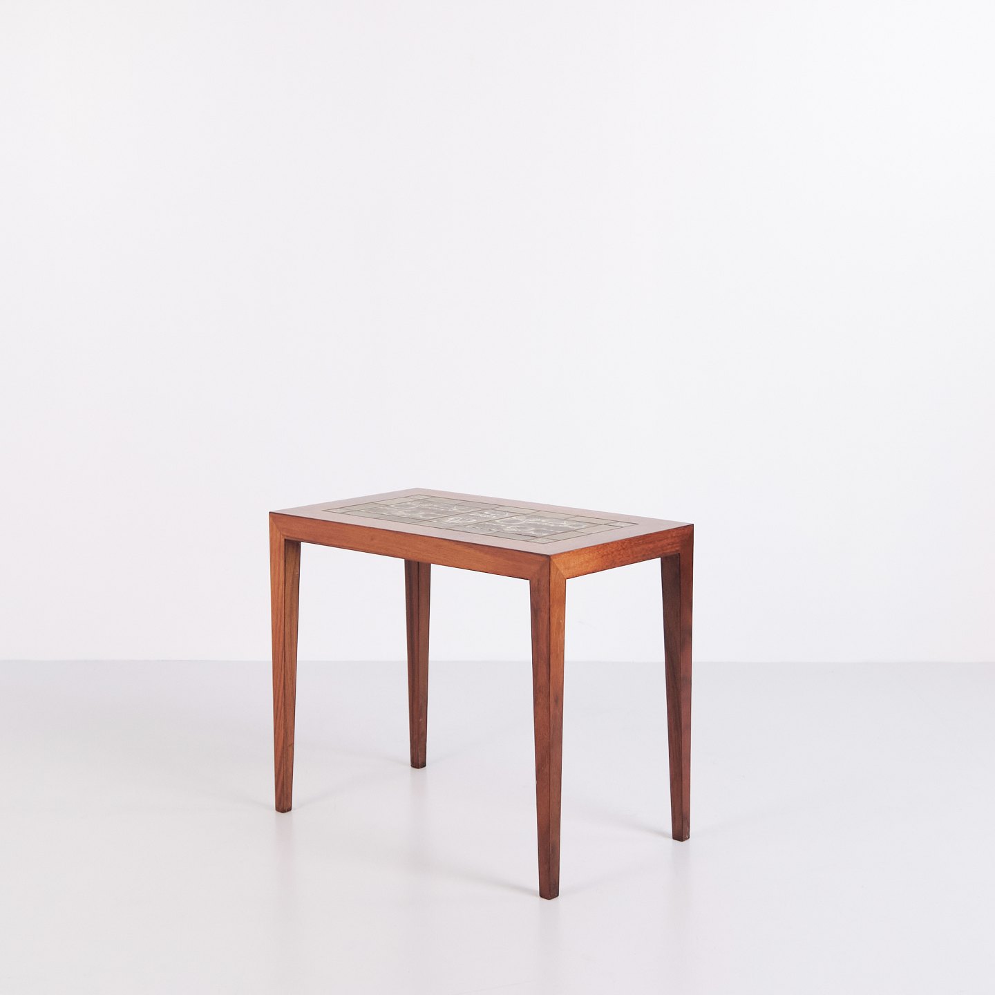 Sidebord, model 163, designet af Severin Hansen og produceret hos Haslev Møbelsnedkeri. Bordet er udført i træ og forsynet med indlagte grønne fajancekakler designet af Nils Thorsson for Royal Copenhagen. Kombinationen af møbelsnedkerarbejde og keramiske kakler er karakteristisk for samarbejder fra 1960’erne og repræsenterer klassisk dansk møbeldesign fra perioden.— Designer: Severin Hansen