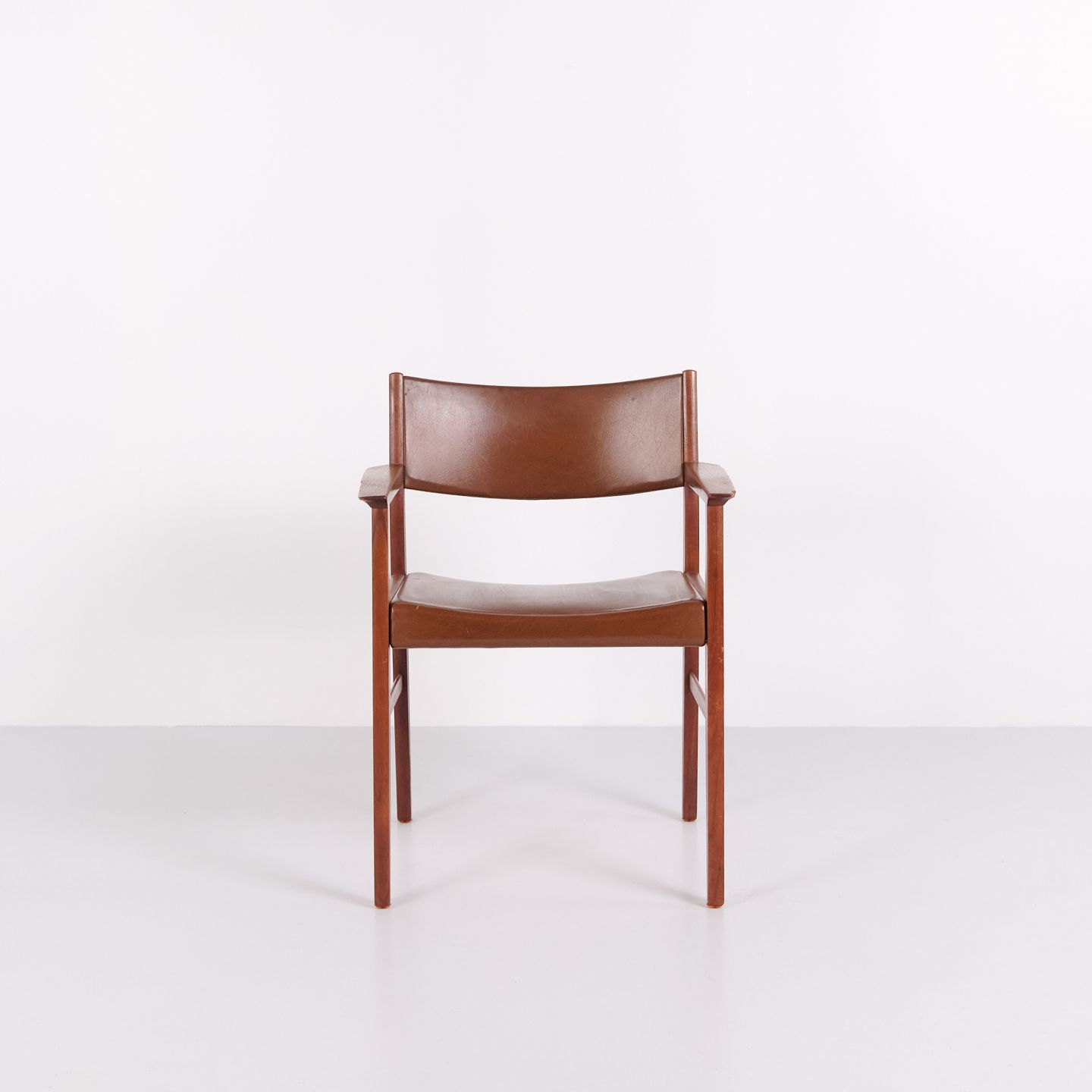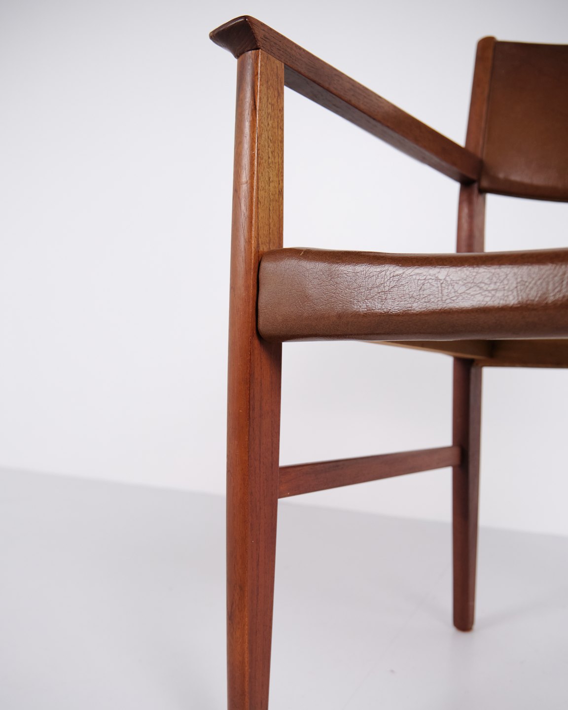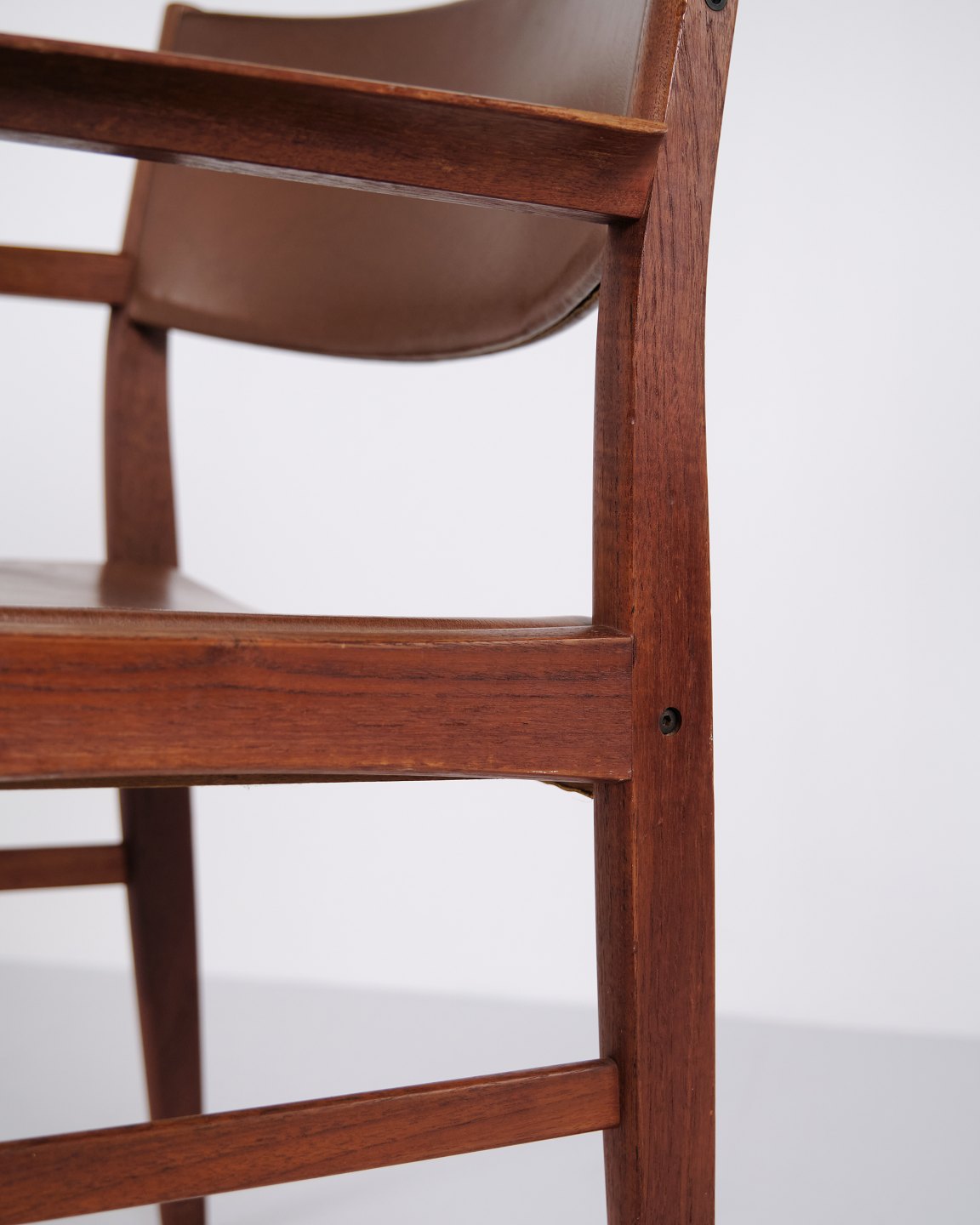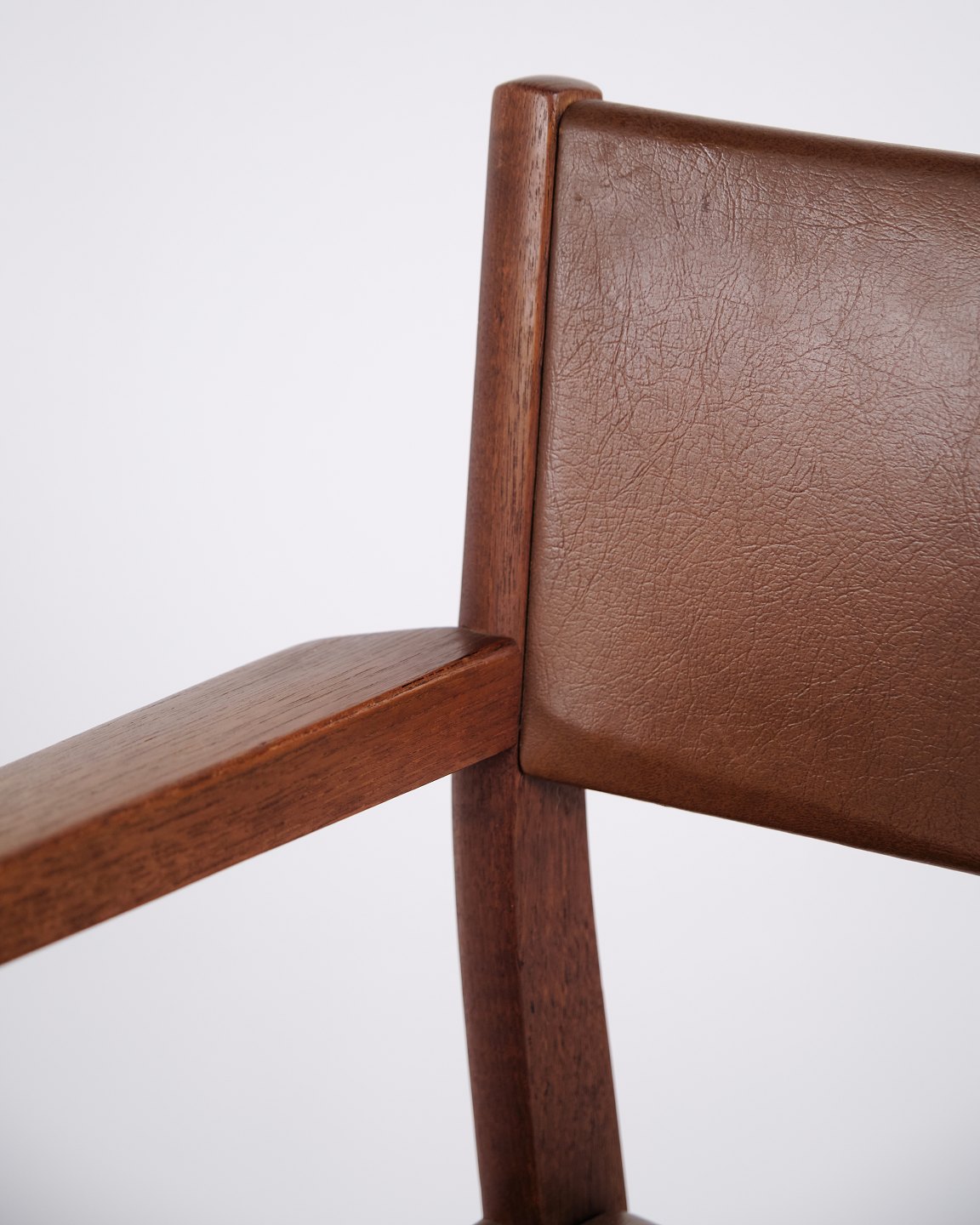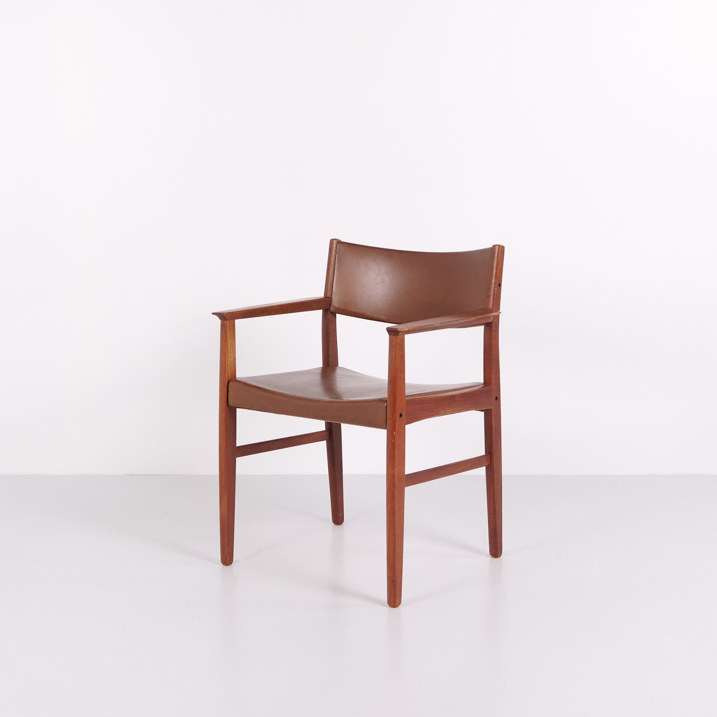 Armstol udført i teaktræ med sæde og ryg betrukket med brunt læder. Stolen er et typisk eksempel på dansk møbeldesign fra 1960’erne, hvor fokus var på funktion, solide materialer og håndværksmæssig kvalitet. Teaktræets varme tone kombineret med læderpolstringen gør stolen velegnet som spisebordsstol, skrivebordsstol eller fritstående armstol.— Oprindelse: Danmark