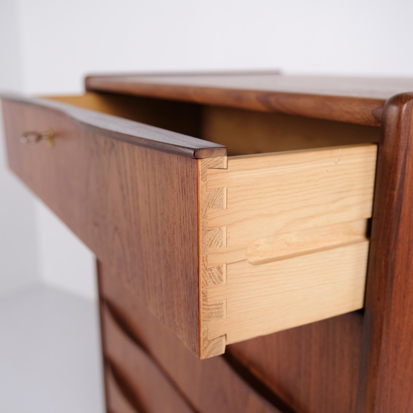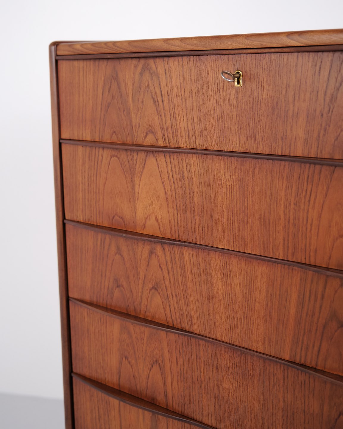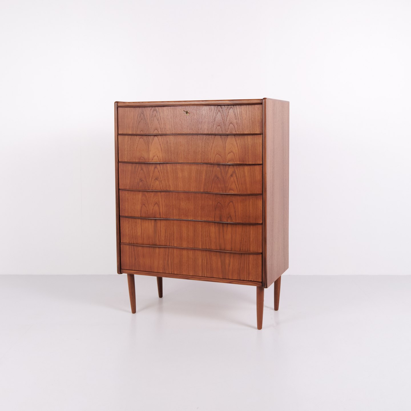 Kommode udført i teaktræ med seks skuffer og originale greb. Møblet er et eksempel på dansk møbeldesign fra 1950’erne, hvor fokus var på funktionalitet, opbevaringsløsninger og materialekvalitet. Den høje form med flere skuffer gør kommoden velegnet til både soveværelse, entré eller opholdsrum.— Materiale: Teaktræ