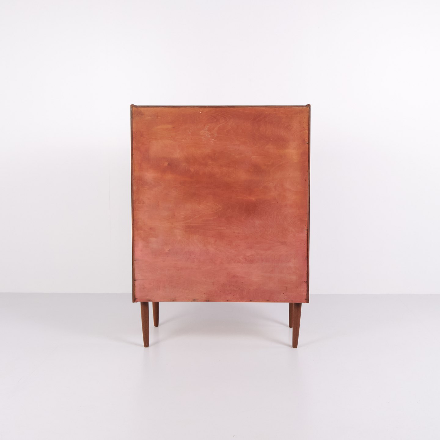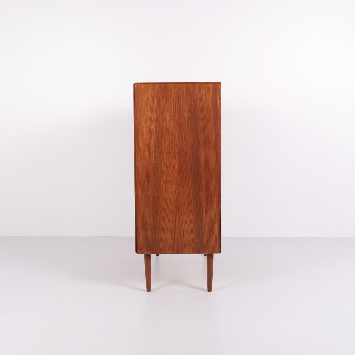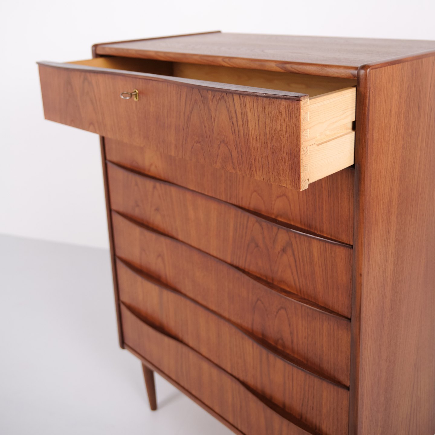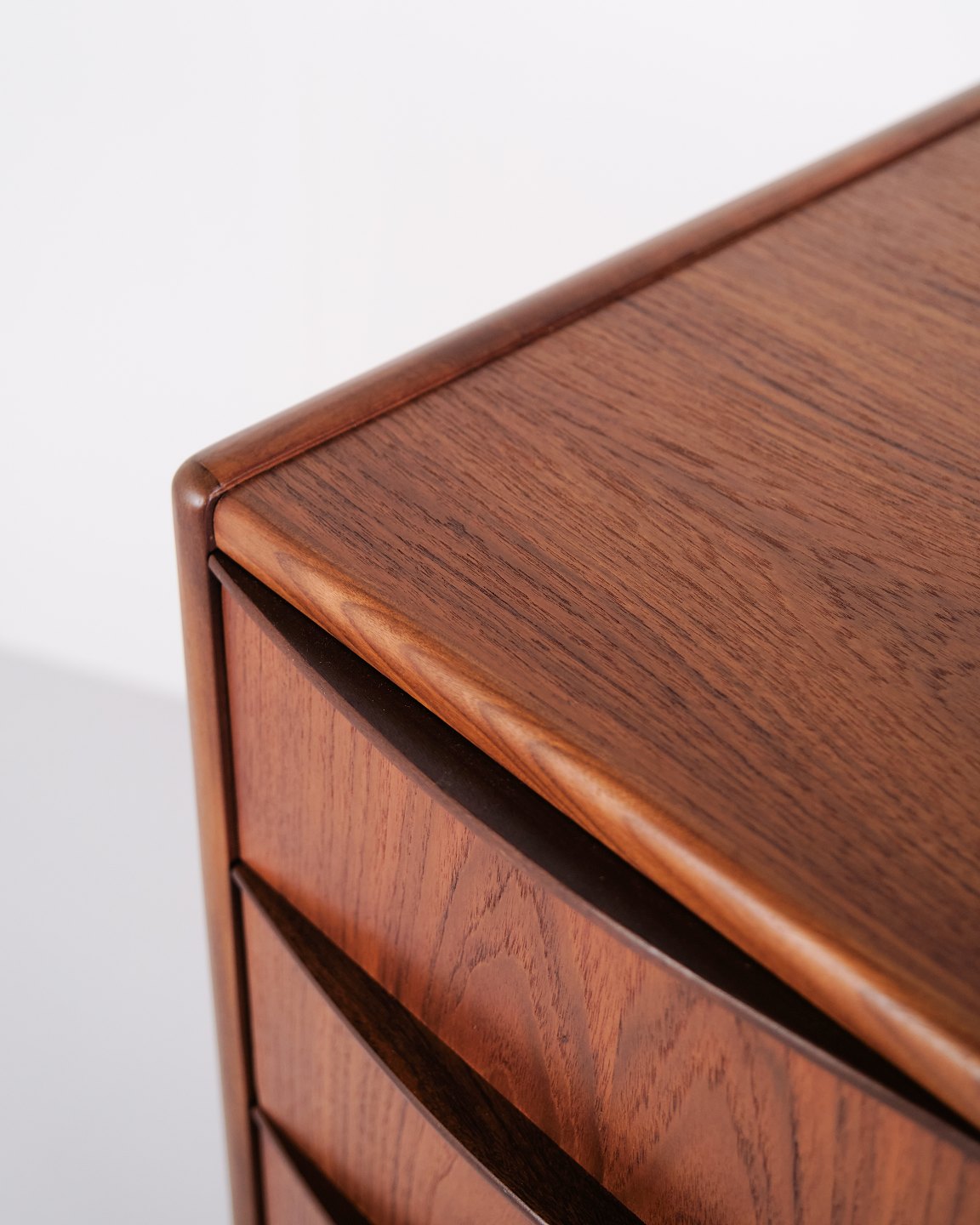 Kommode udført i teaktræ med seks skuffer og originale greb. Møblet er et eksempel på dansk møbeldesign fra 1950’erne, hvor fokus var på funktionalitet, opbevaringsløsninger og materialekvalitet. Den høje form med flere skuffer gør kommoden velegnet til både soveværelse, entré eller opholdsrum.— Materiale: Teaktræ