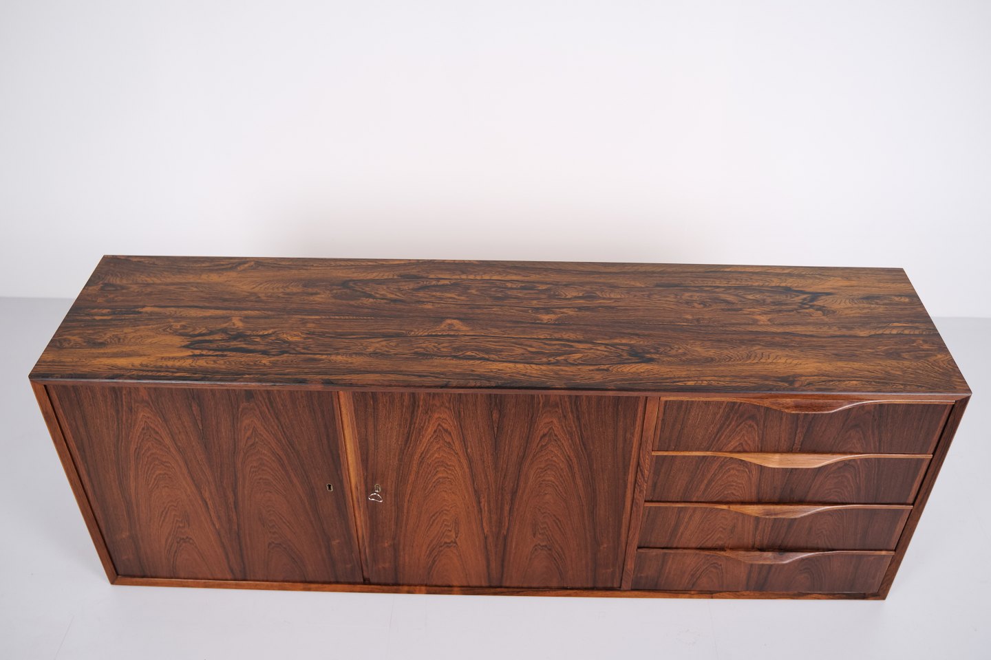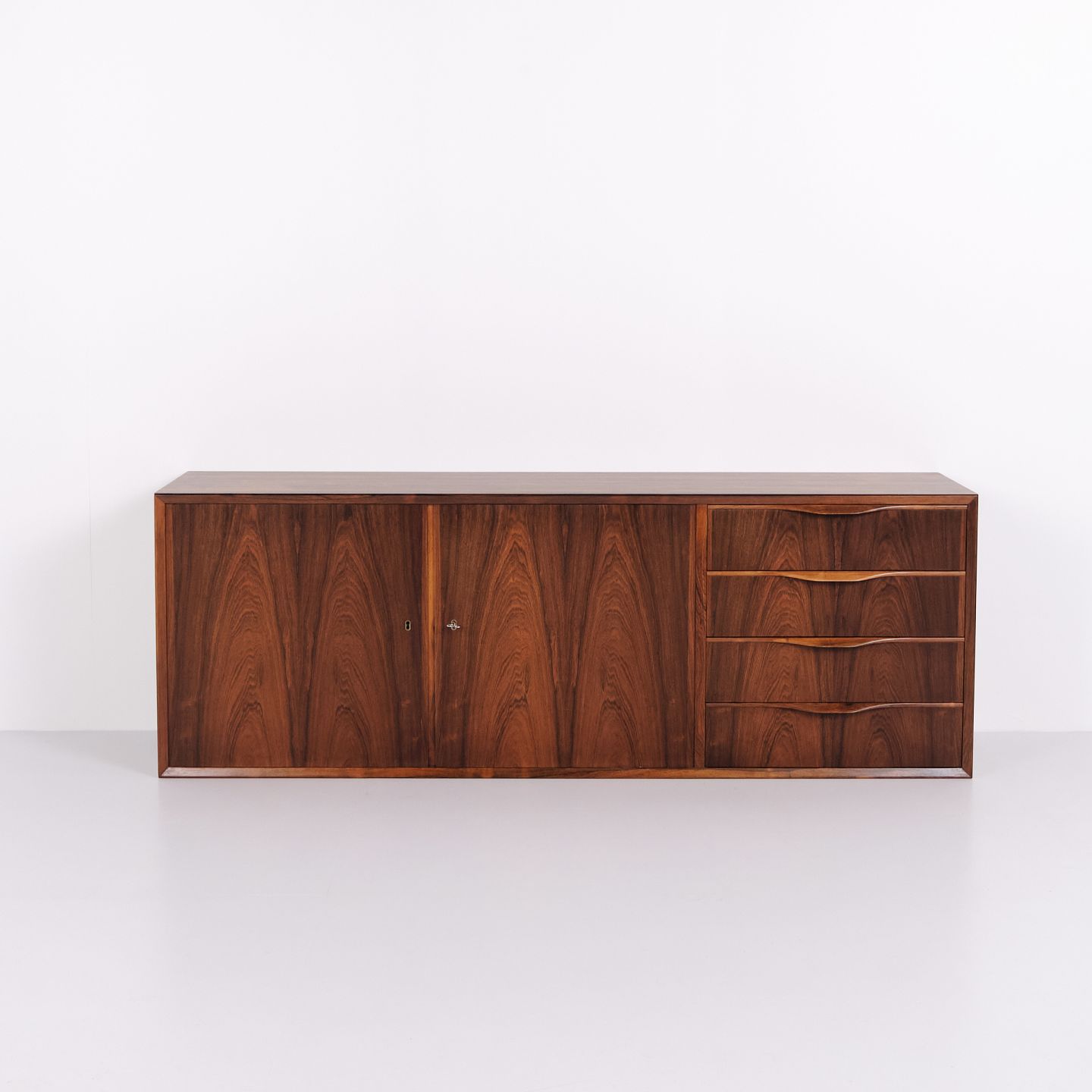 Væghængt skænk udført i palisander, designet af Erling Torvits og produceret hos Klim Møbelfabrik i 1950’erne. Skænken er karakteriseret ved et funktionelt ophængt design, der frigør gulvplads og var typisk for periodens danske møbelproduktion. Udførelsen i palisander understreger fokus på materialekvalitet og snedkerarbejde.— Designer: Erling Torvits