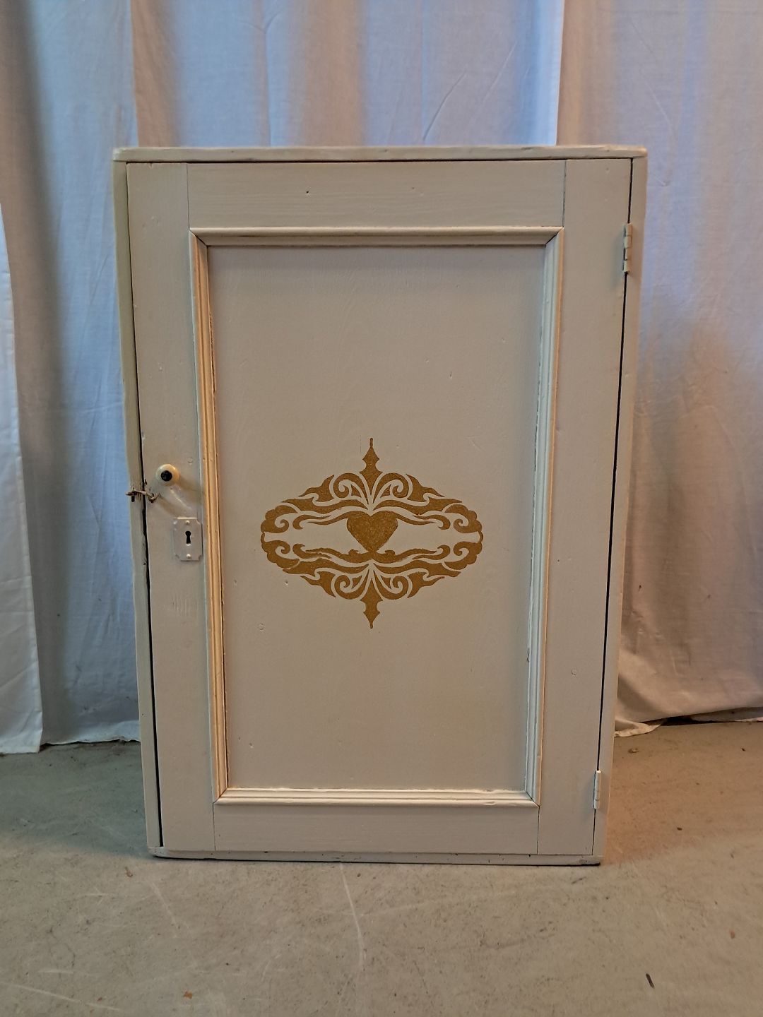 Malet vægskab i massivt fyrretræ,fra 1920erne.Det har brugsspor og der medfølger ikke nøgle.