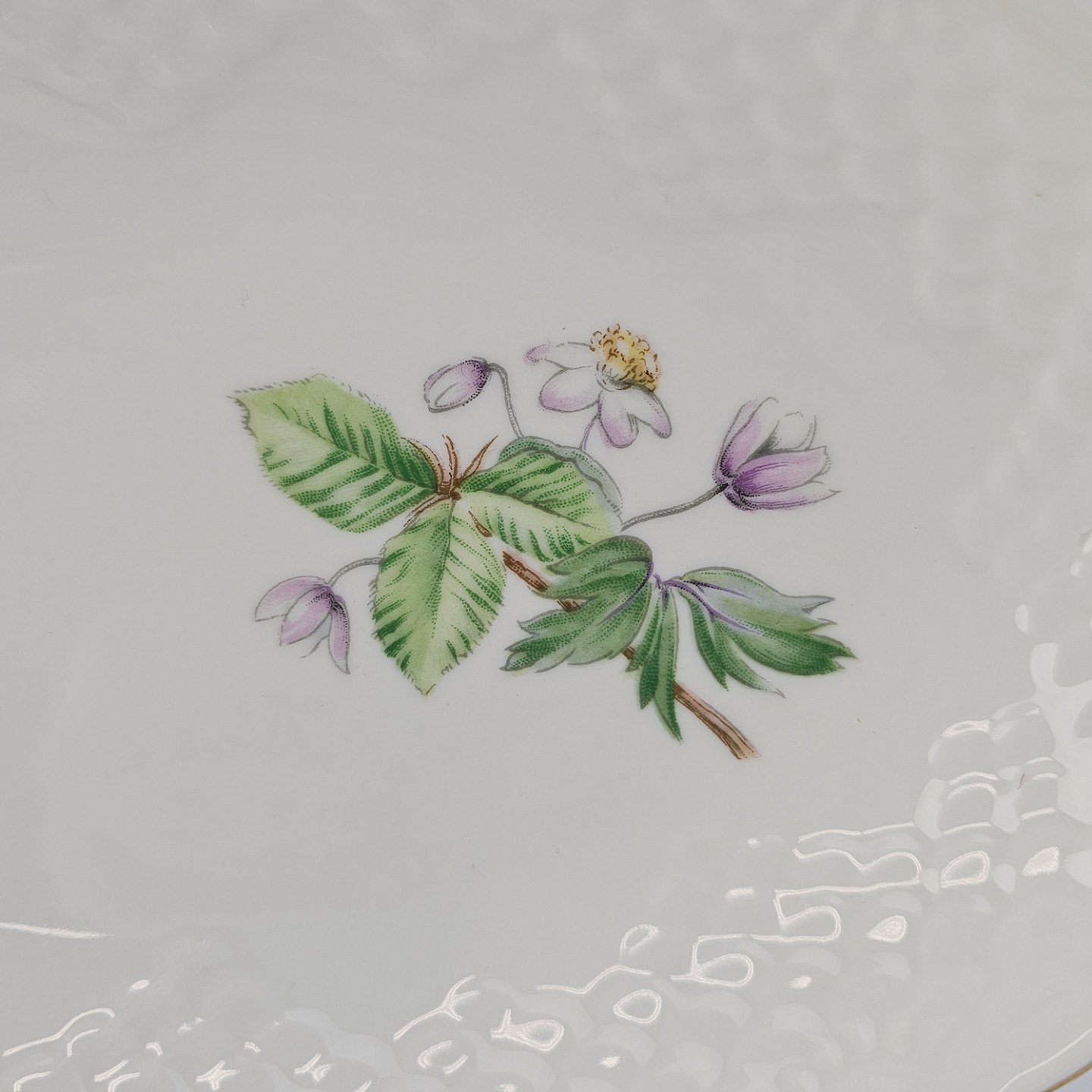 Frigga Anemone er cremefarvet porcelæn dekoreret med motiv af anemoner og bøgeløv med guldkant