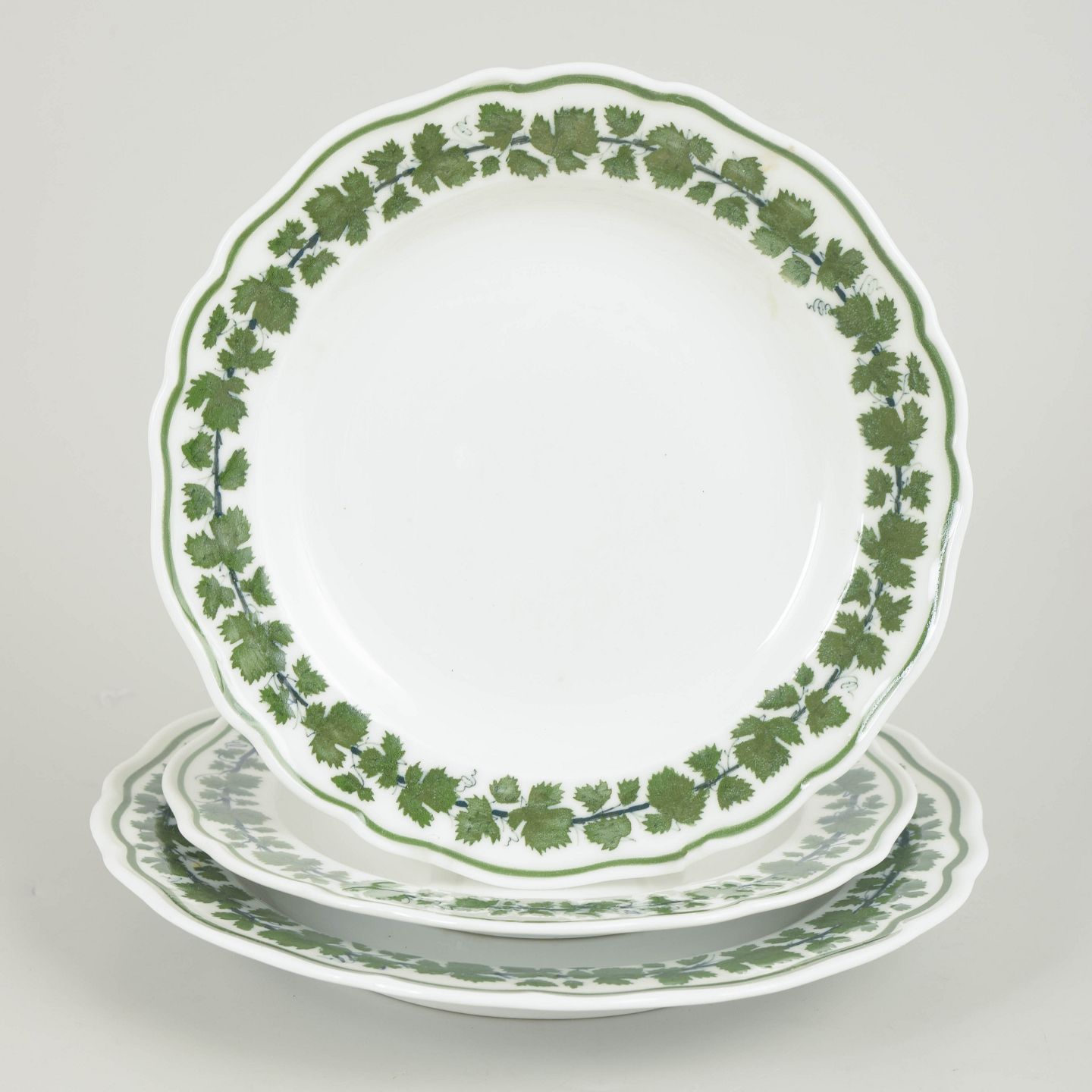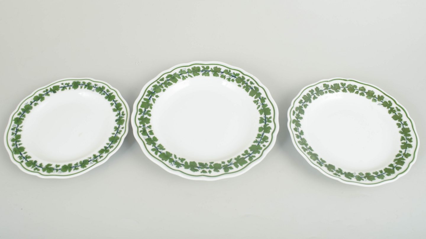 Meissen, sæt med tre tallerkener fra den grønne vinløvsserie.Sæt bestående af tre tallerkener i porcelæn med grøn vinranke- og vinløvsdekoration langs fanen; fra den grønne vinløvsserie.