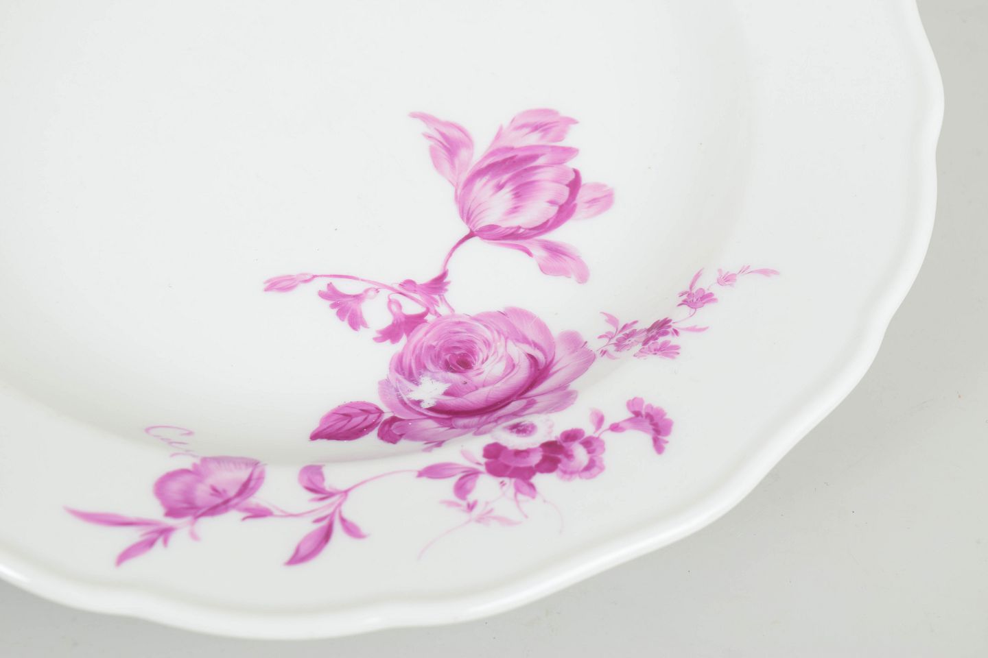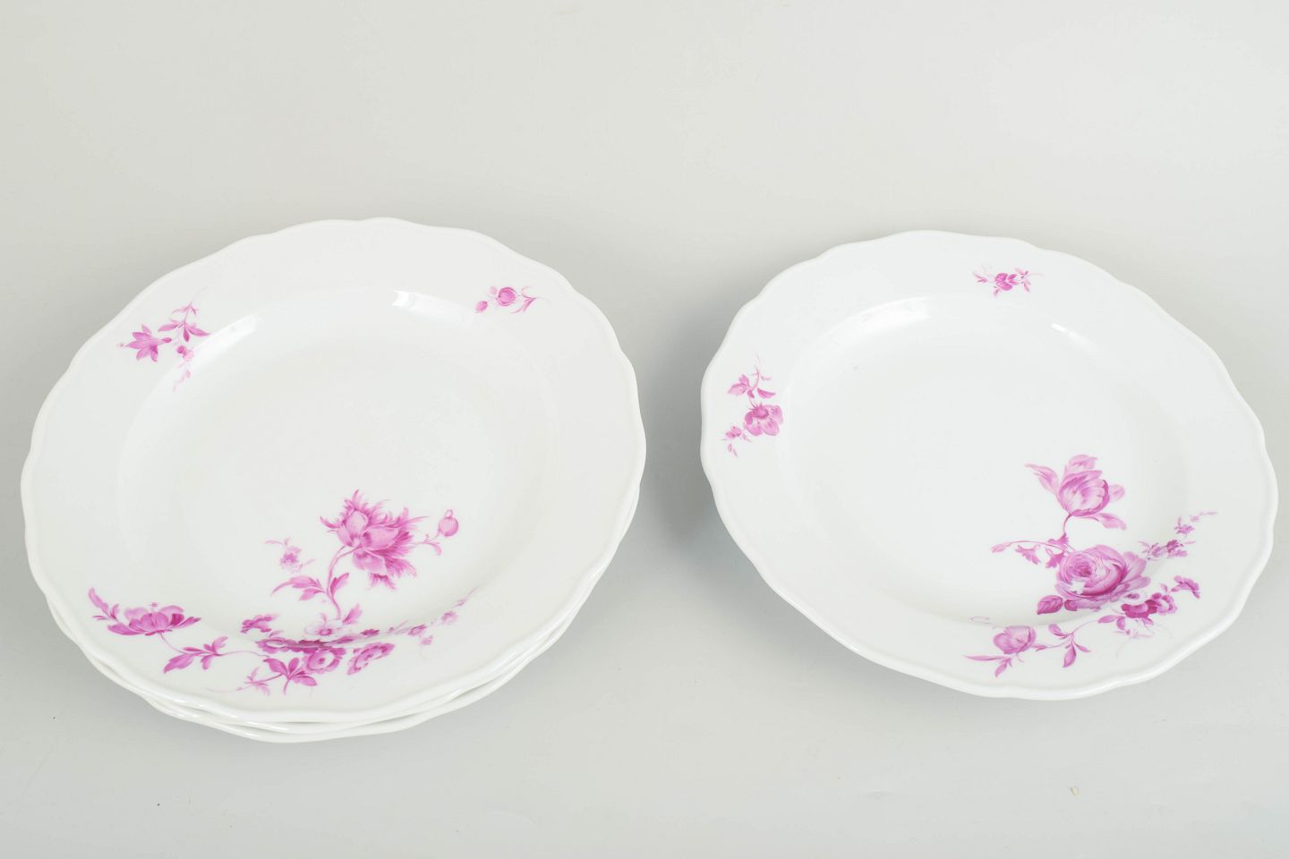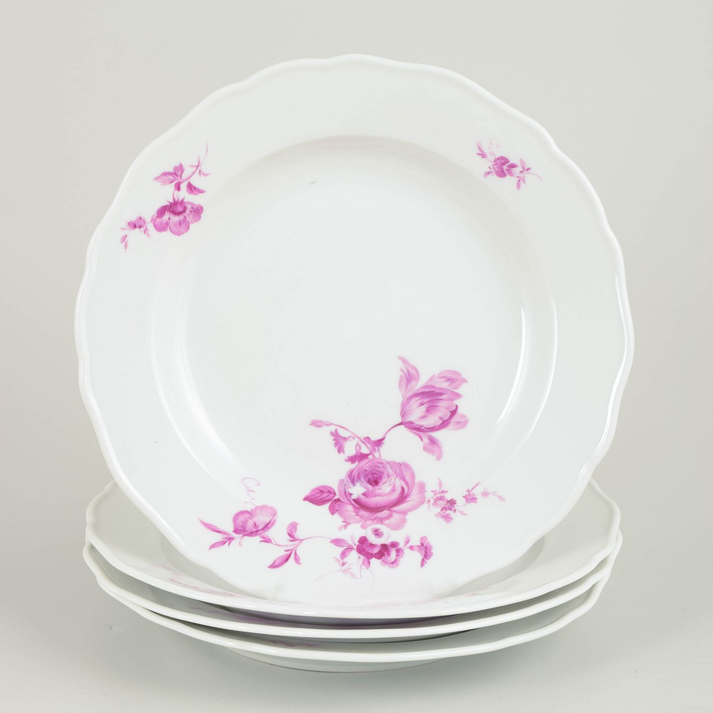 Meissen, sæt på 4 middagstallerkener.Sæt med fire tallerkener i hvidglaseret porcelæn dekoreret med håndmalede blomster i rosa nuancer.