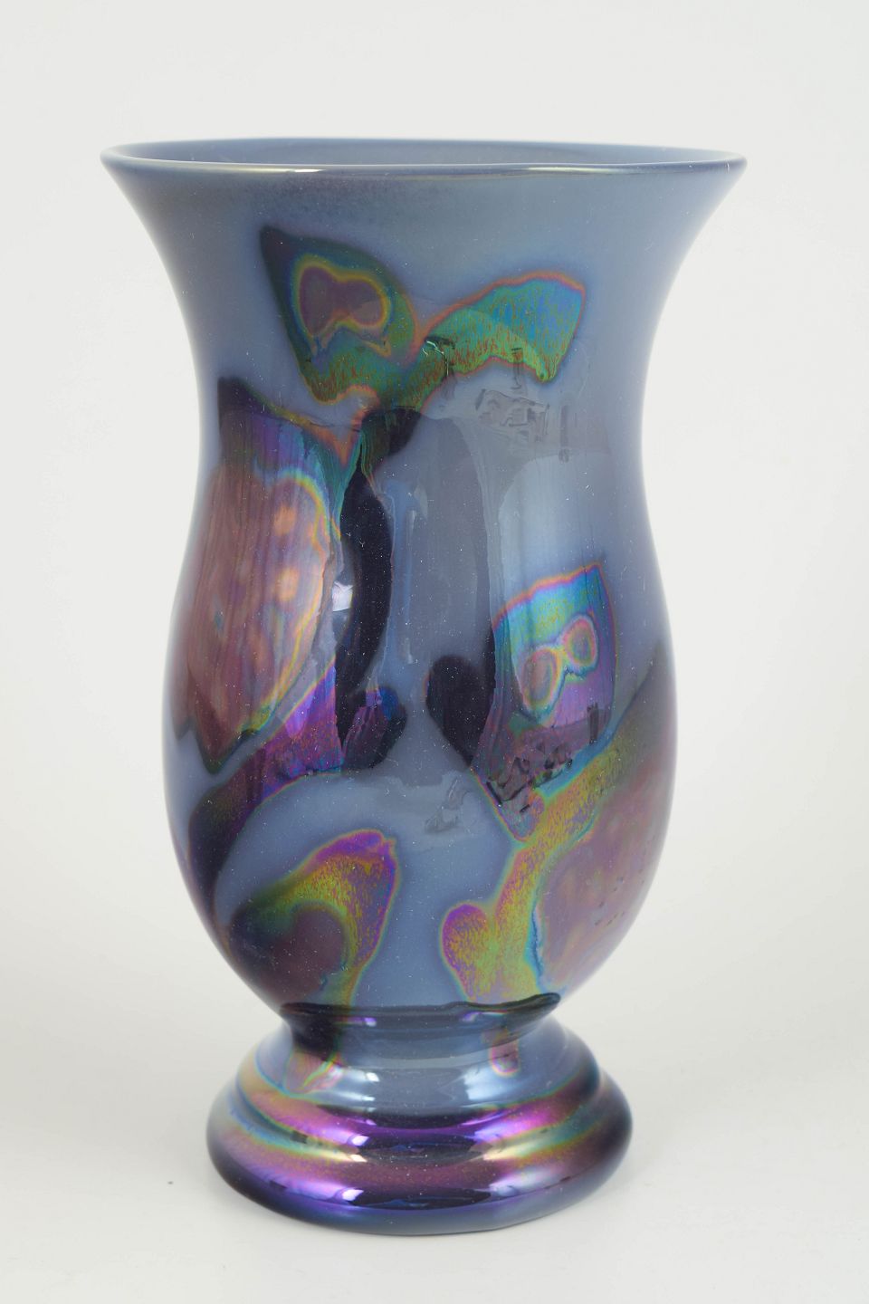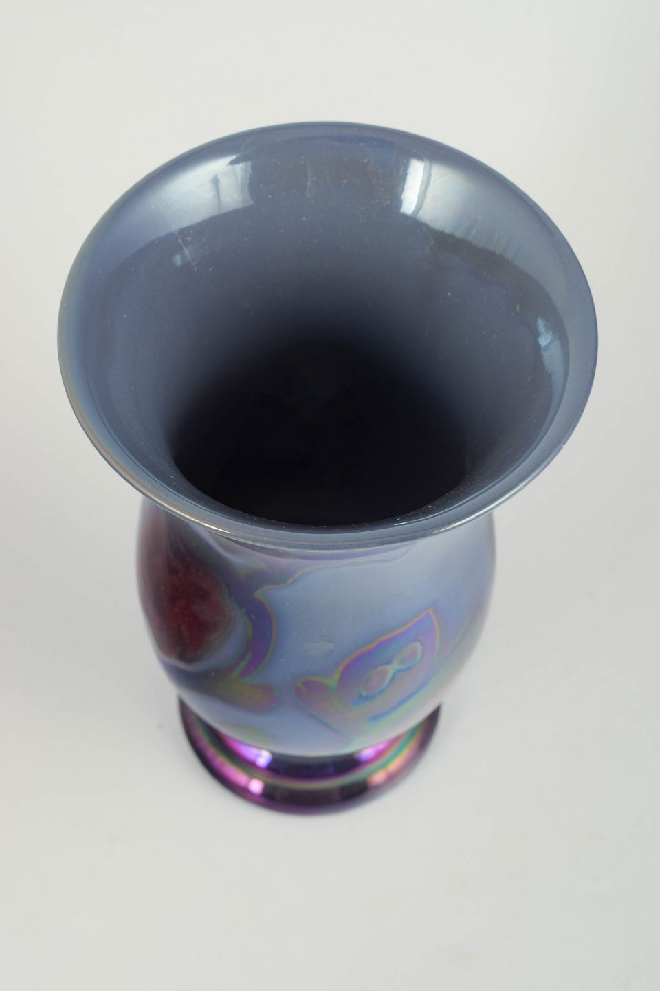 Edgar Böckman for Höganäs, vase.Dekorativ vase i glaseret keramik med blank luster-/metalglansglasur og abstrakte, iriserende farvespil i blå, violette og grønne toner.