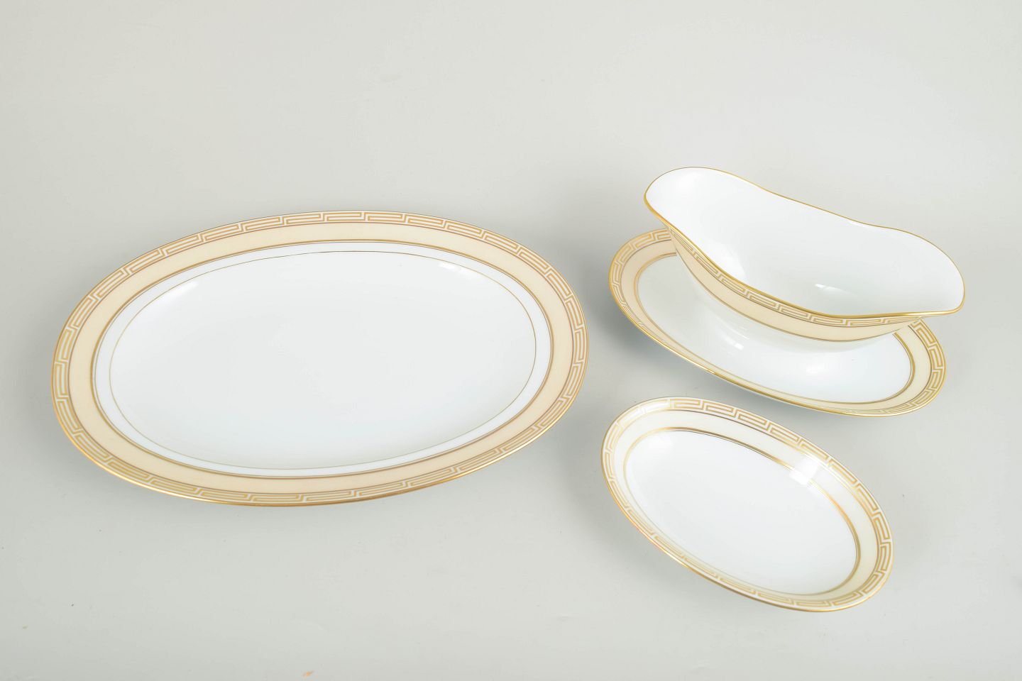 Bing & Grøndahl Rossini, sæt bestående af sovseskål, serveringsfad og lille fad.Sæt i hvidglaseret porcelæn med forgyldt kant og geometrisk bort i art deco-stil; modeller 317 og 316.