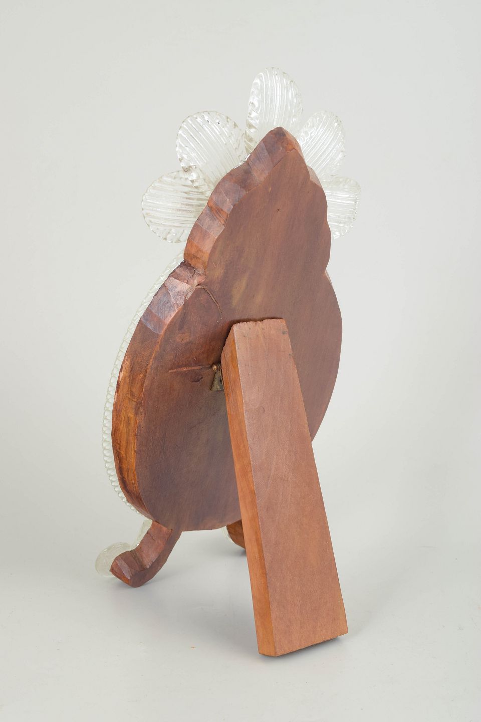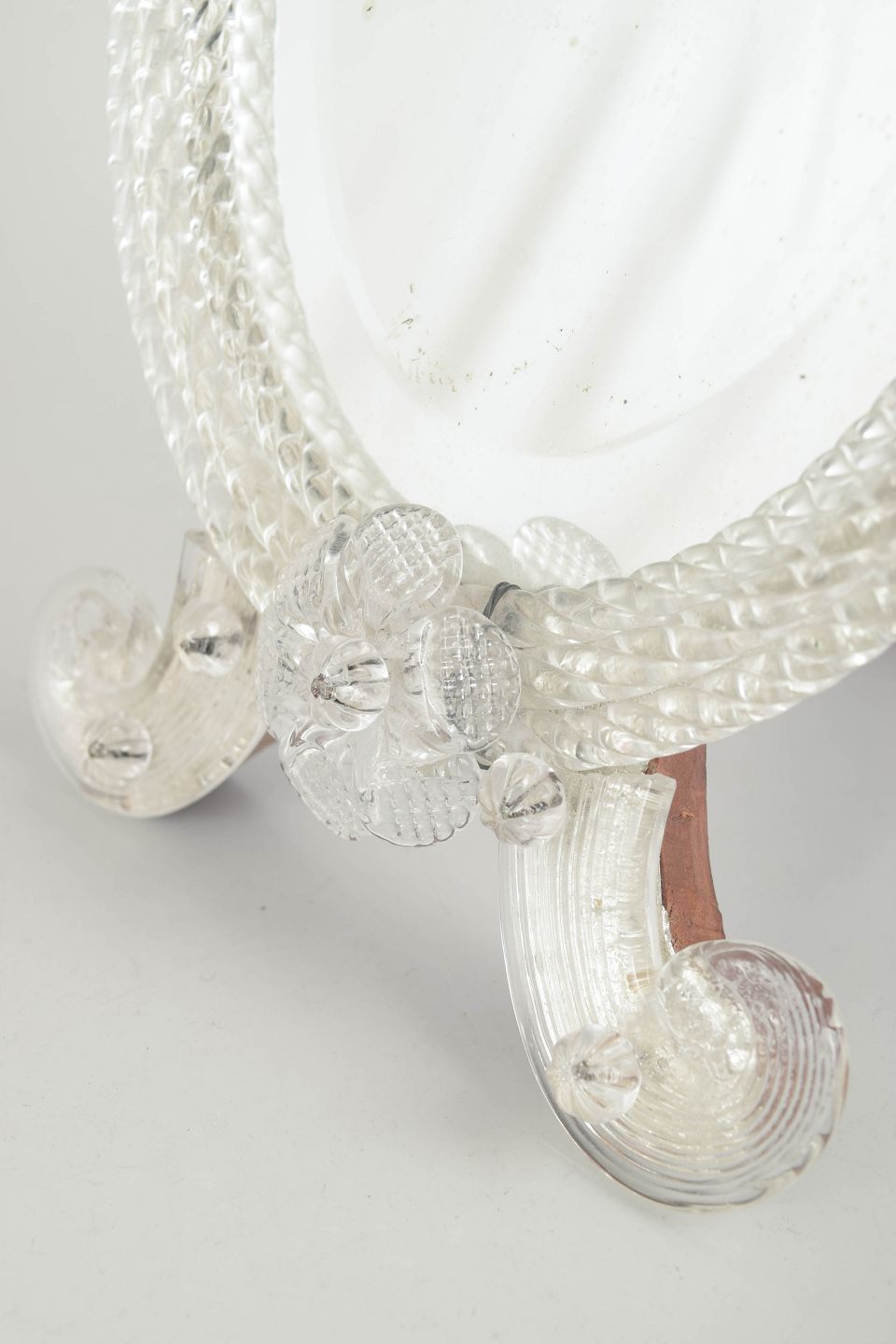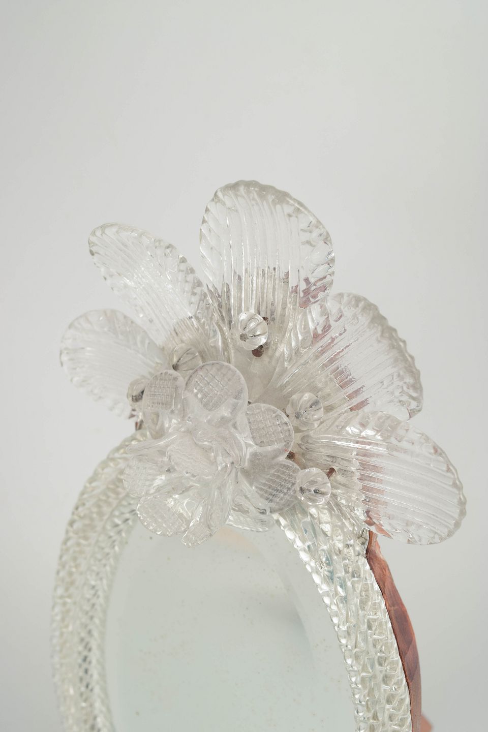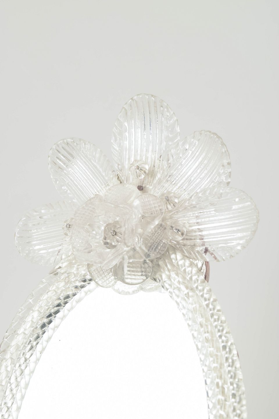 Venetiansk spejl, Murano.Ovalt spejl med rigt dekoreret ramme i klart glas, udført med blomster- og bladdekor samt fødder i samme stil; Murano.