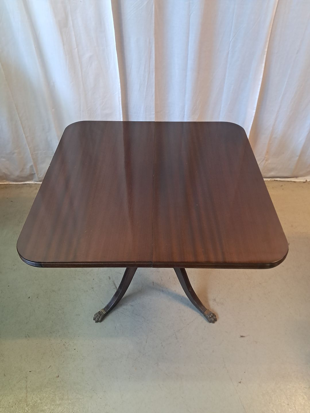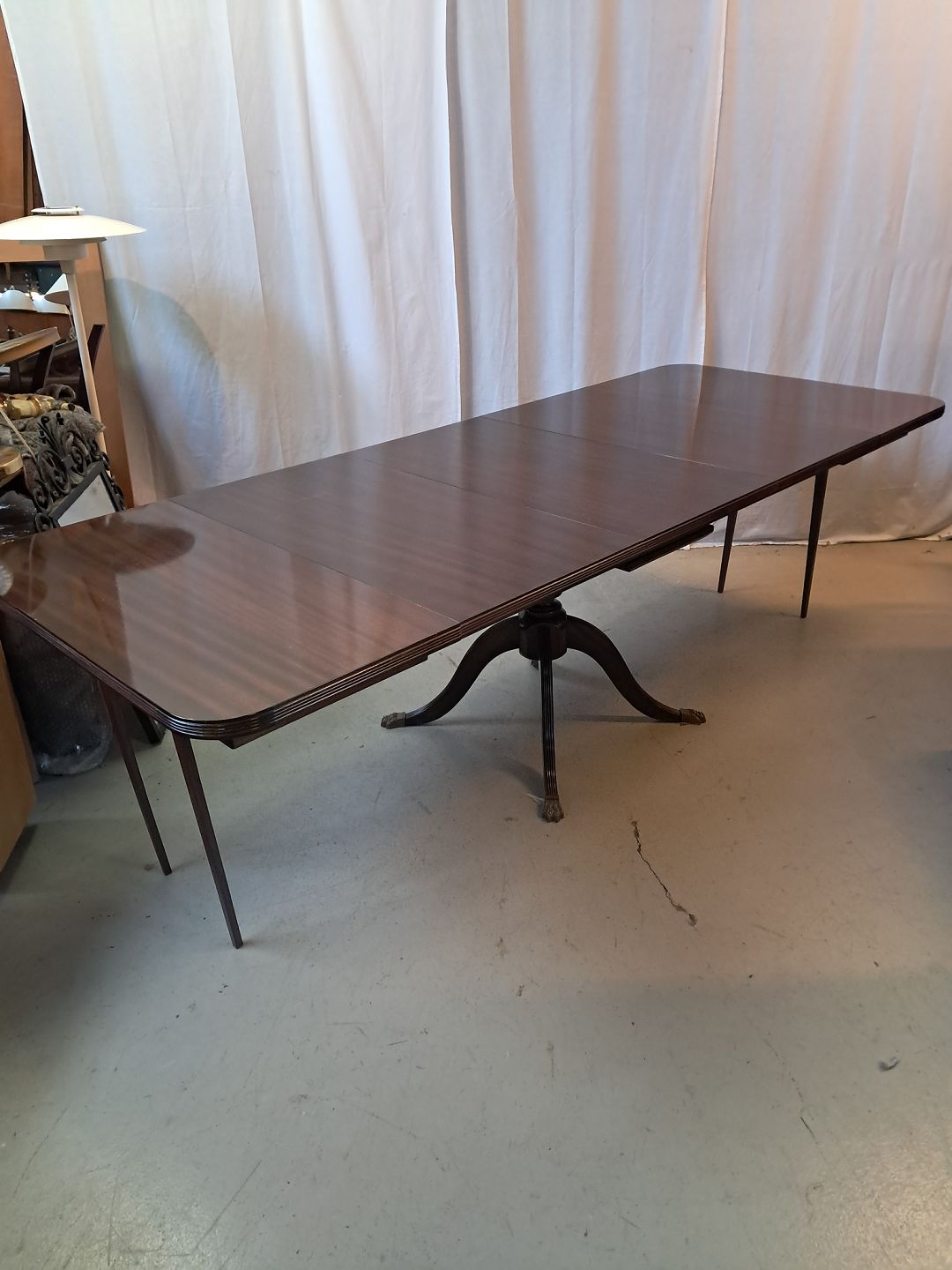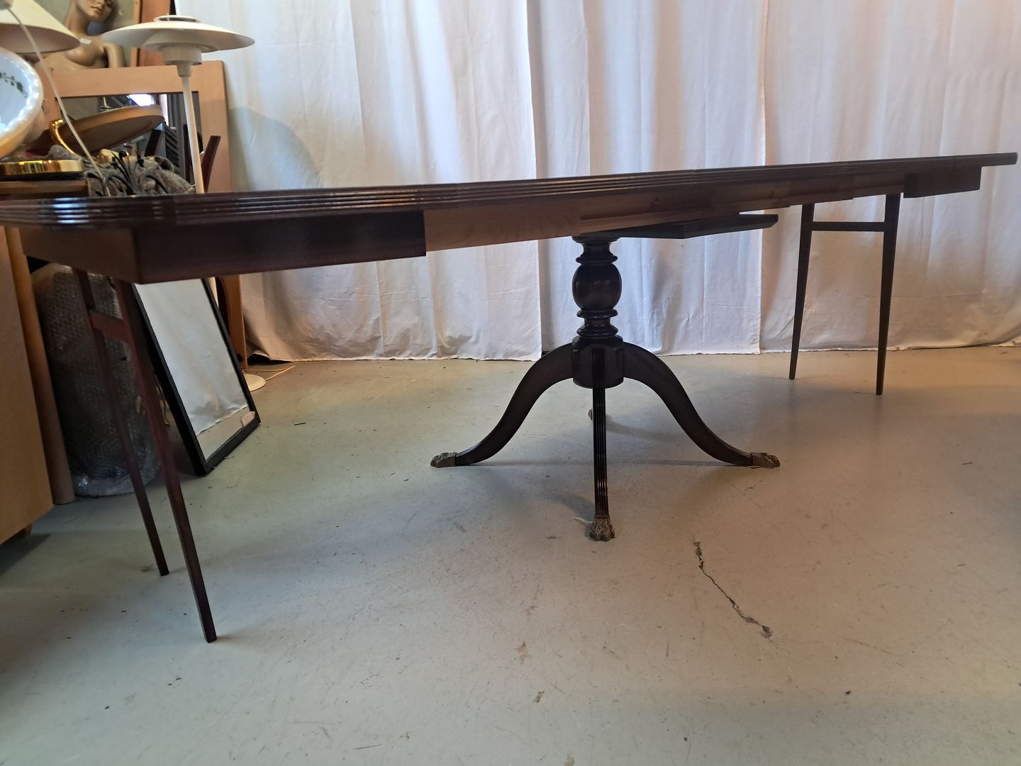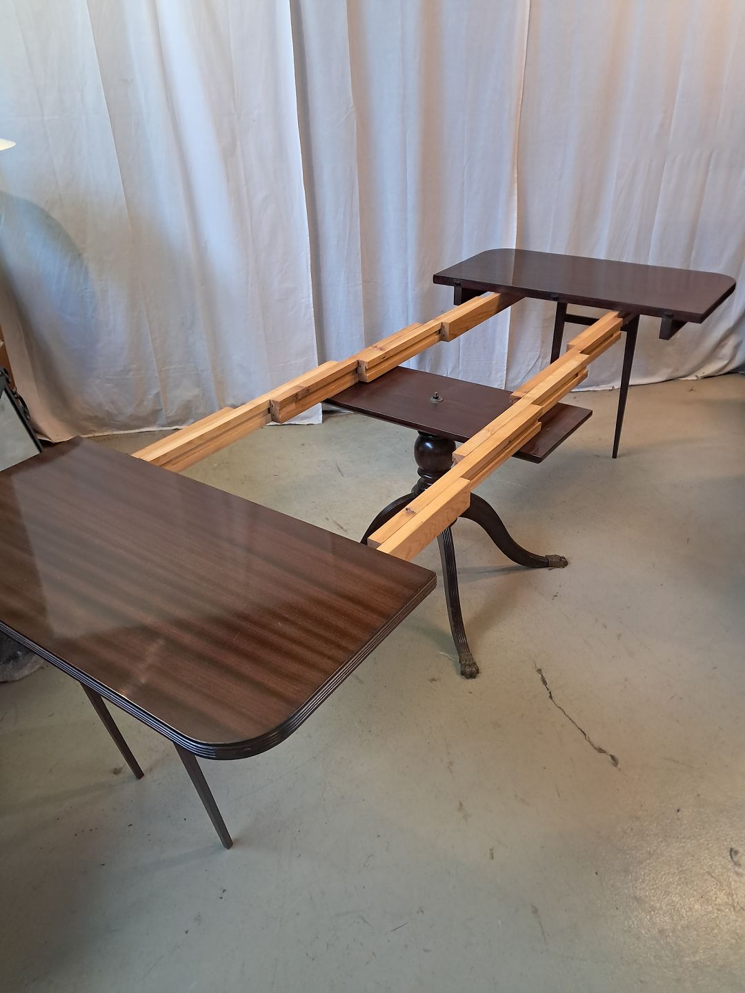 Spisebord i fineret mahogni med 3 tillægsplader, fra 1980erne.Det har små brugsspor.