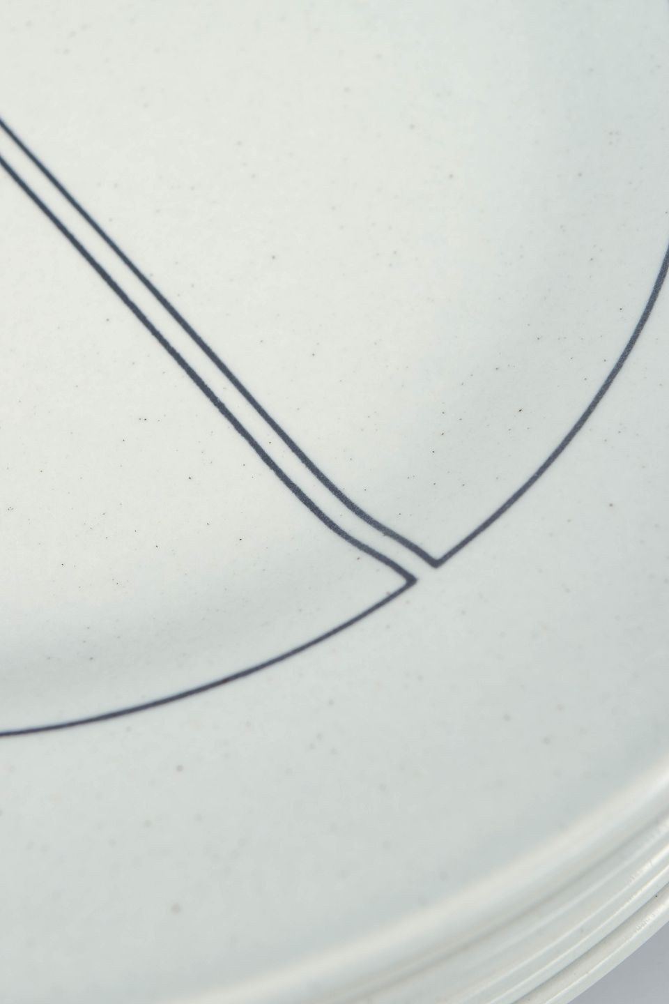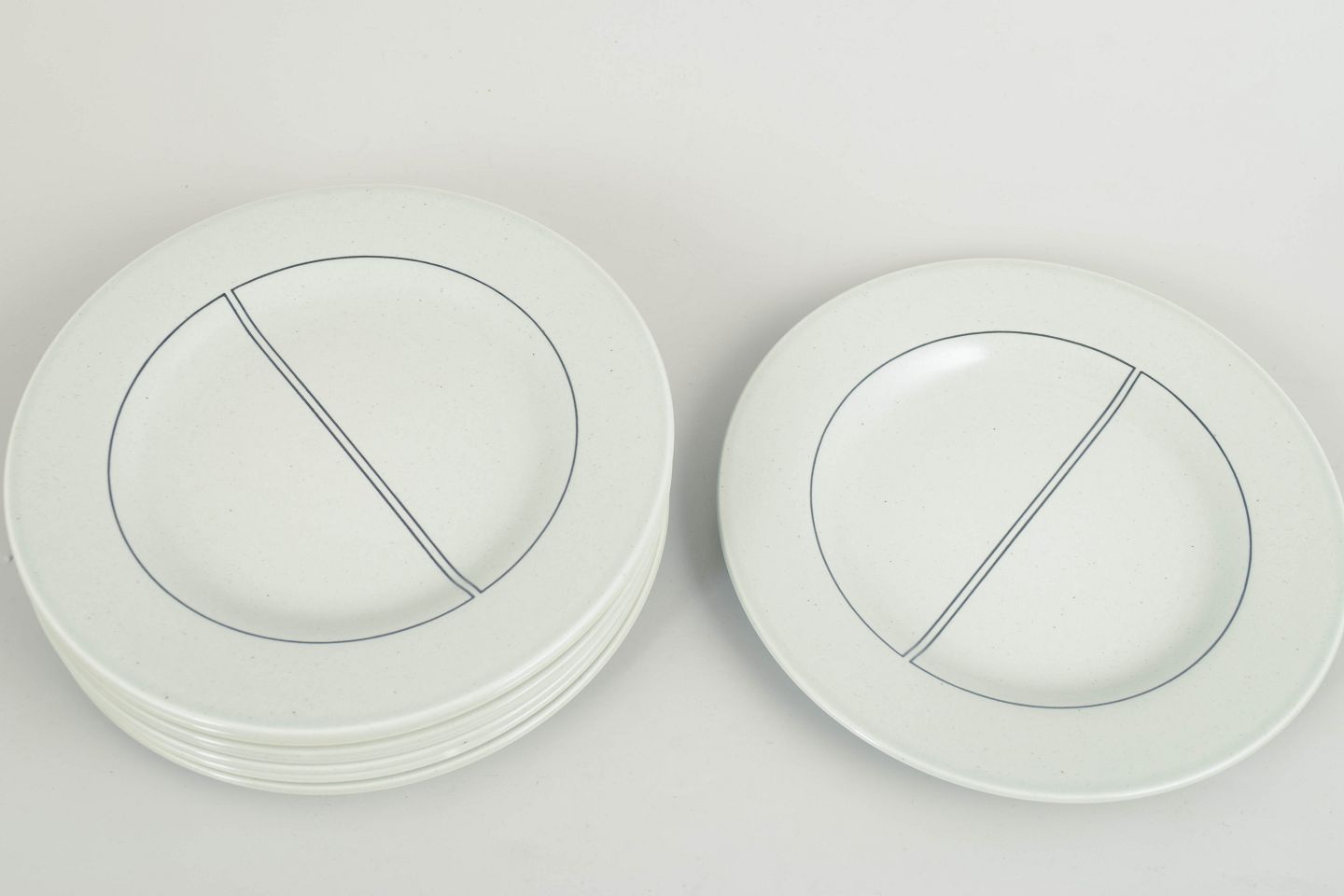 Stig Lindberg for Gustavsberg, små frokosttallerkener. Sæt på otte.Flade tallerkener i fajance med hvid glasur og grafisk dekoration med sort cirkel og skrå linje, udført i modellen “Demi”.