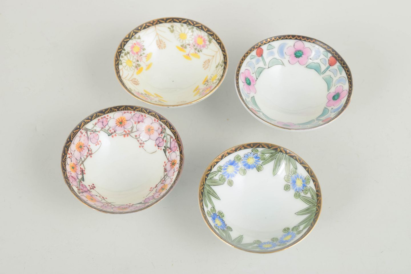 Sæt med 4 små kinesiske porcelænsskåle, hånddekorerede.Sæt med fire små porcelænsskåle, hver med håndmalet dekoration i varierende motiver og farver, herunder blomster og stiliserede ornamenter. Skålene har underglasurblå og røde mærker under bunden.