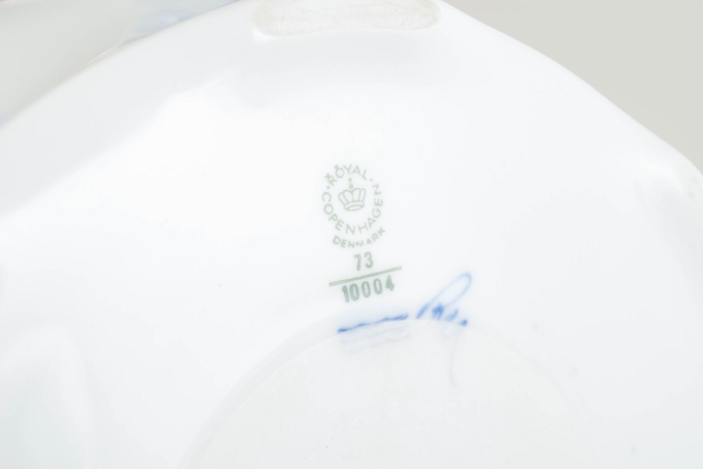 Elegant terrin i hvidt porcelæn med bløde, bølgende konturer og diskret reliefdekoration. Låget afsluttes af en lille figurknop, og terrinen har sidehanke. Stemplet med Royal Copenhagen. Modelnummer 73 og dekornummer 10004, 1. sortering.
