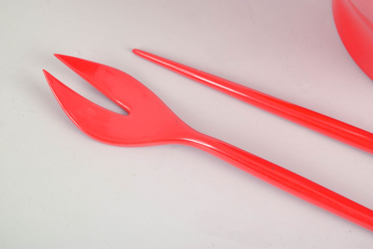 Henning Koppel for Torben Ørskov, salatskål med serveringsbestik.Organisk formet salatskål i rød plast med matchende serveringsske og -gaffel. Stemplet på undersiden “T. Ørskov & Co” samt H.K. Design Denmark”.