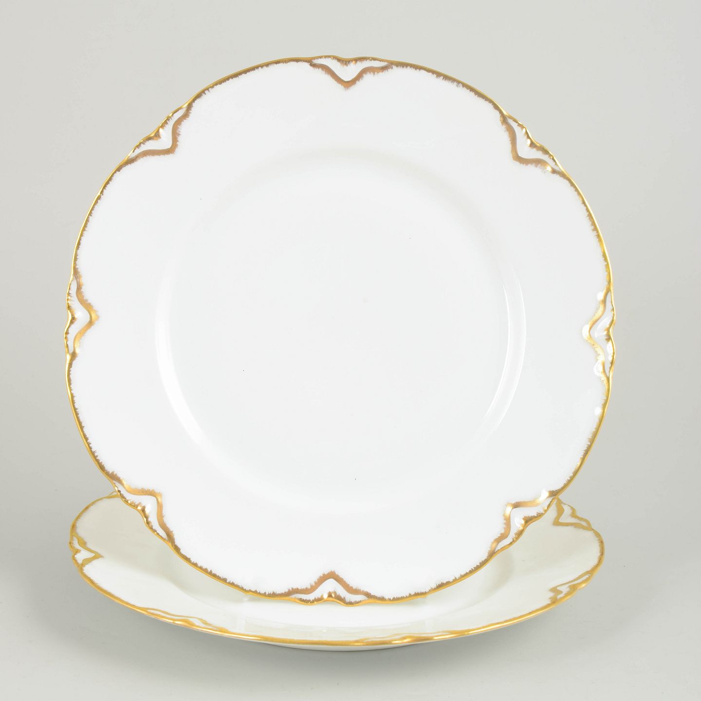 Haviland/Limoges, 2 middagstallerkener af porcelæn.To franske middagstallerkener i hvid fajance med bølget fane og dekoration i forgyldt kant samt stiliserede, Art Deco-inspirerede gulddetaljer langs randen.
