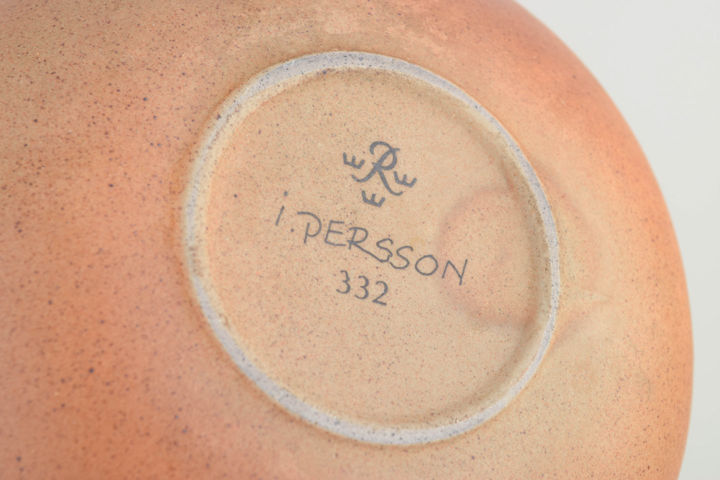 Inger Persson for Rörstrand, tepotte.Sjælden tepotte i stentøj med mat, varm orange/sandfarvet glasur og markant sort, trekantet dekoration på korpus. Udstyret med sort låg samt høj bøjlehank, som giver en skulpturel silhuet. Model 332.