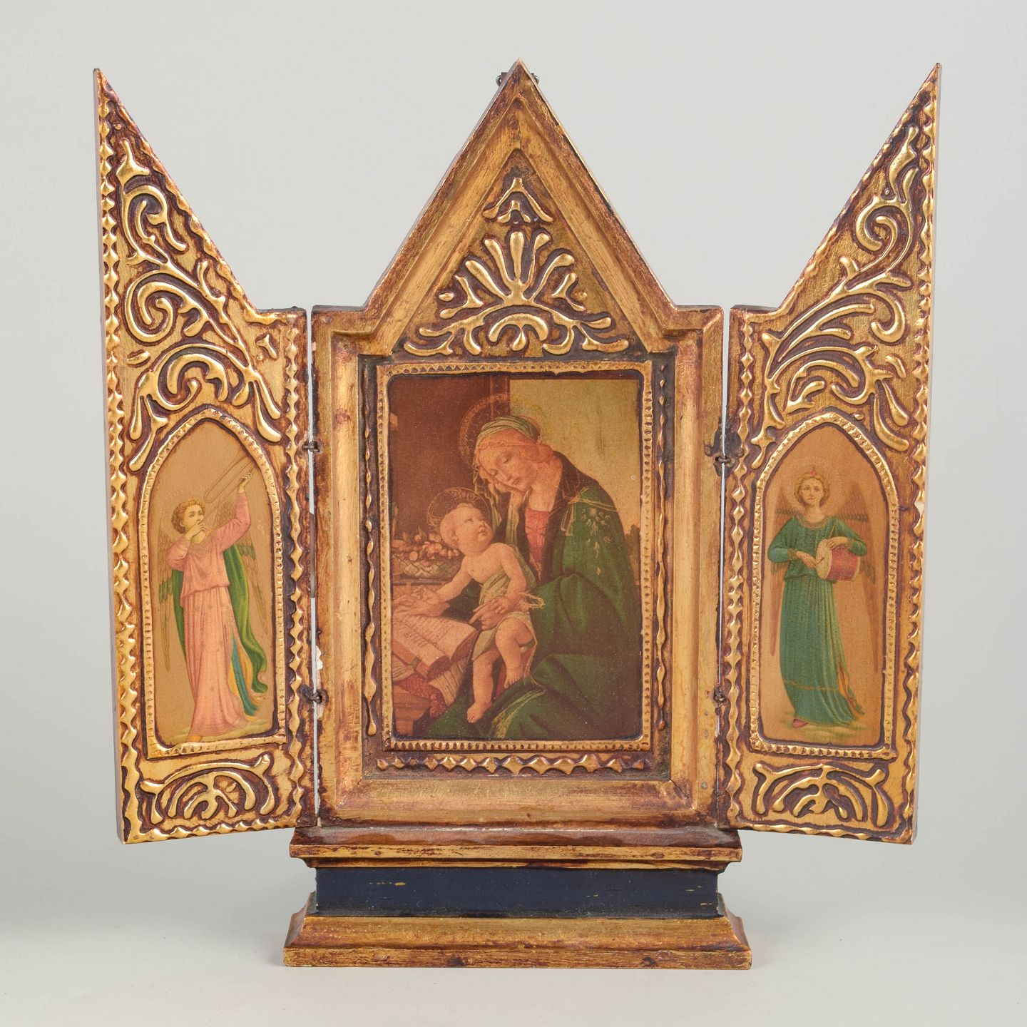 Antik russisk ikon-triptykon, 1800-tallet.Foldbart triptykon med centralt ikonmotiv af Madonna med Barn, flankeret af helgenfigurer på sidefløjene. Udført som maleri på træ med forgyldt og ornamenteret ramme.