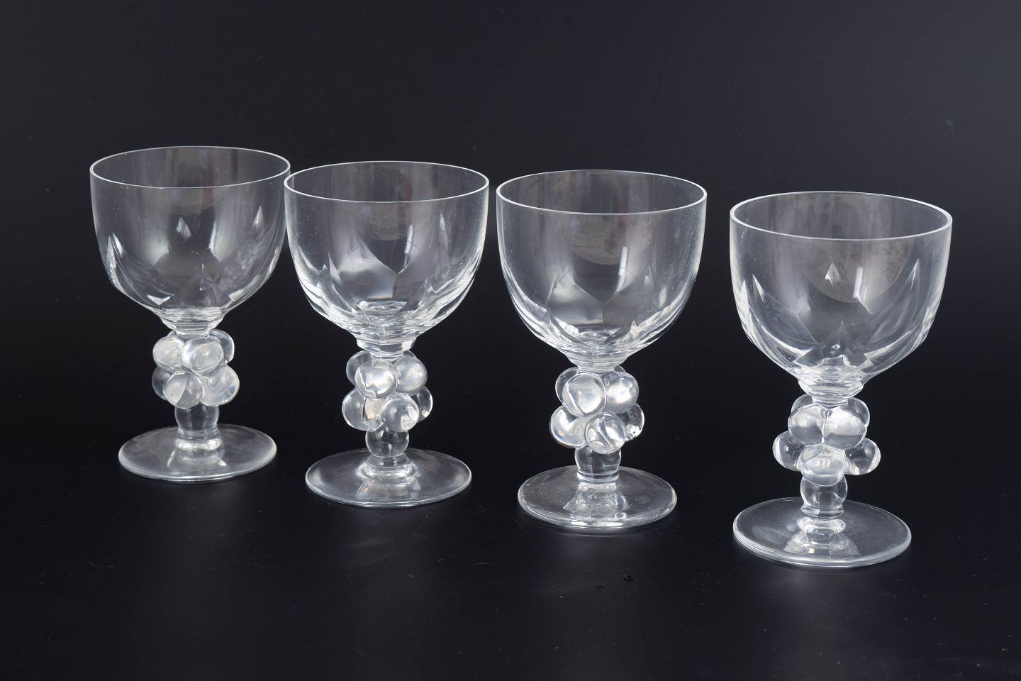 René Lalique, Clos Vougeot Burgundy glasses, set of 4.Set of four large and rare wine glasses in clear moulded glass with faceted bowls and stems formed as clusters of grapes. The “Clos Vougeot” model is characterised by refined Art Deco-inspired symmetry, where decorative elements also serve a sculptural and functional purpose. The glasses are signed to the base.