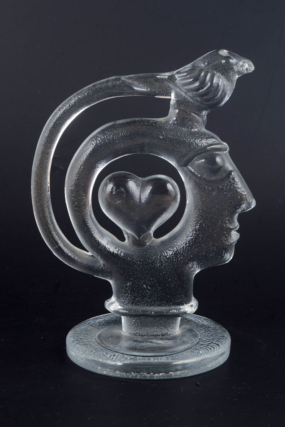 Bertil Vallien for Kosta Boda, figurative glass sculpture.Sculptural form in clear solid glass with a stylised human head in profile, an integrated heart shape at the centre, and a bird figure positioned at the top of the curved structure. The surface shows lightly frosted areas and internal air bubbles, creating depth and optical effects in the glass. Unsigned.
