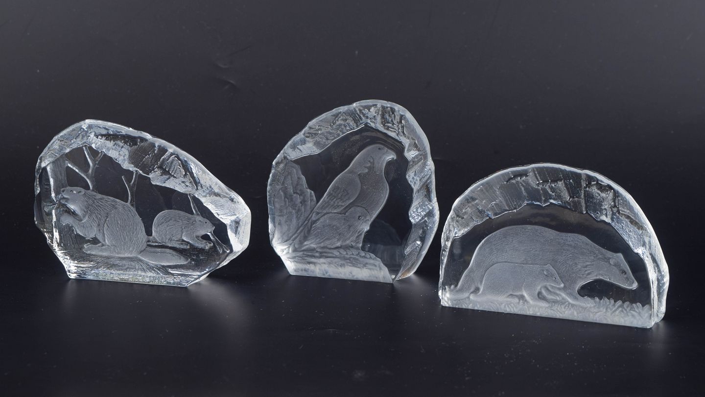 Paul Isling for Svenskt Glas, WWF figures, set of 3.Sculptural art glass sculptures with engraved animal motifs, executed in clear glass and issued as a limited edition in collaboration with WWF.