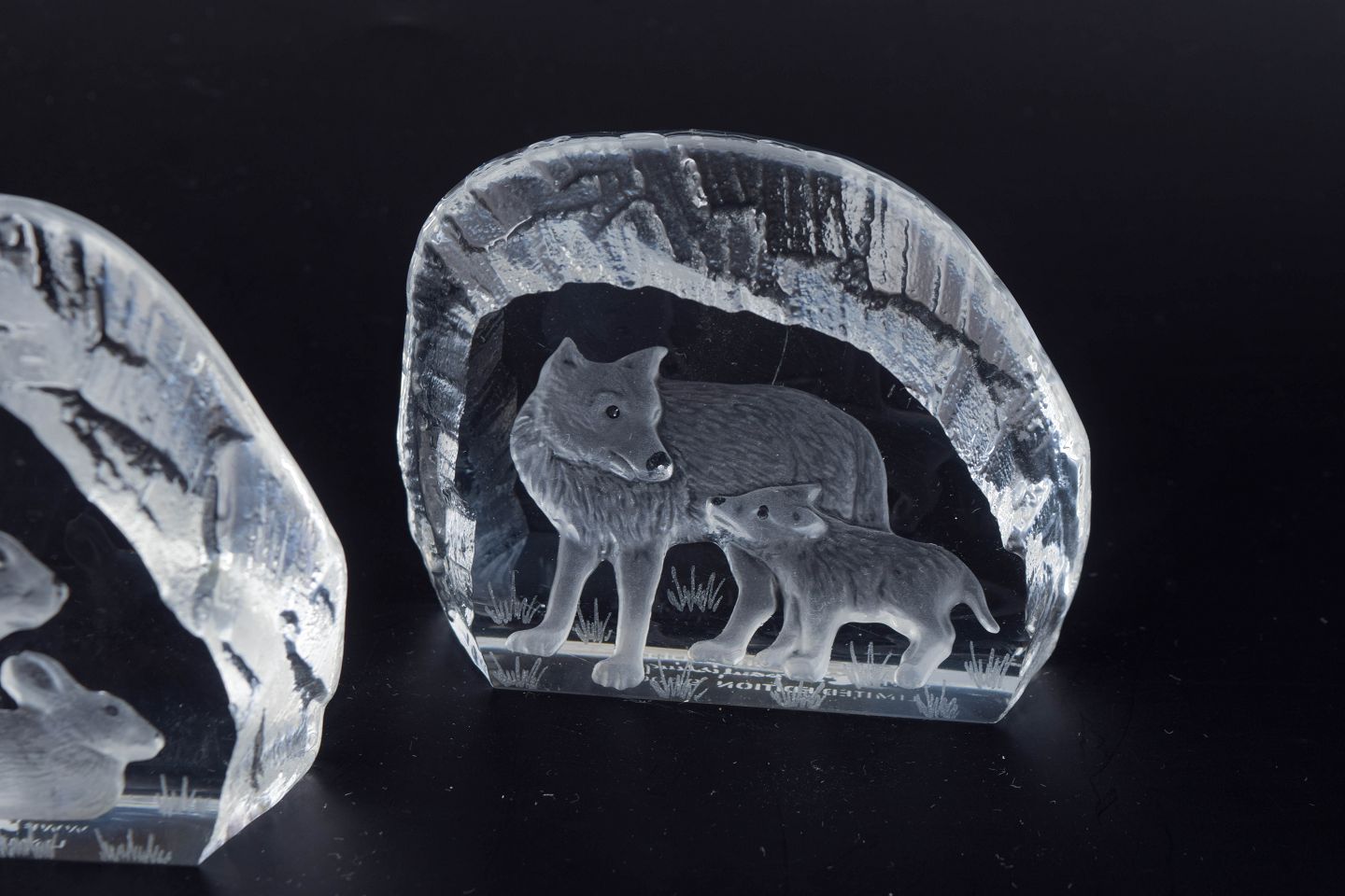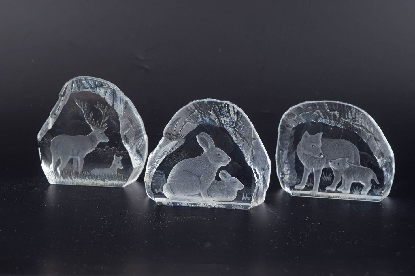 Paul Isling for Svenskt Glas, WWF art glass objects, set of 3.Sculptural glass figures with engraved animal motifs (moose, hare and wolf), executed in clear glass and issued as a limited edition in collaboration with WWF.