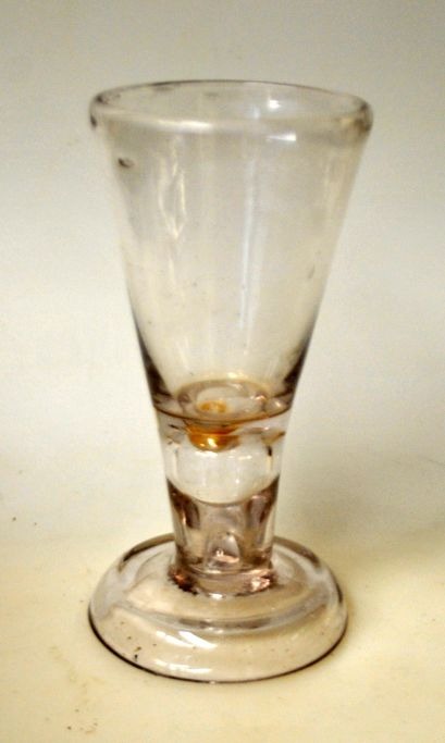 Frimurerglas. Conradsminde, 1834 - 1857, Danmark. Klart glas med bøjet fod og hul stilk. Dia.: 5,6 cm. H.: 12,5 cm.Emne nummer: 28837