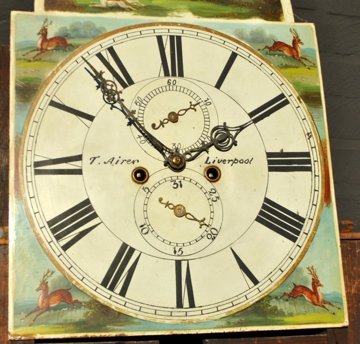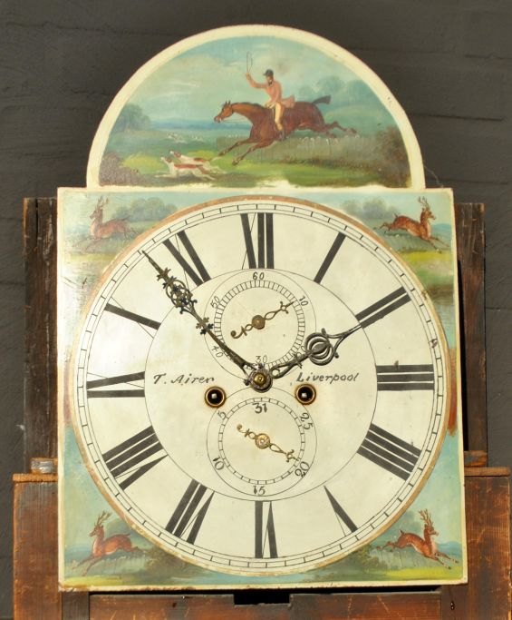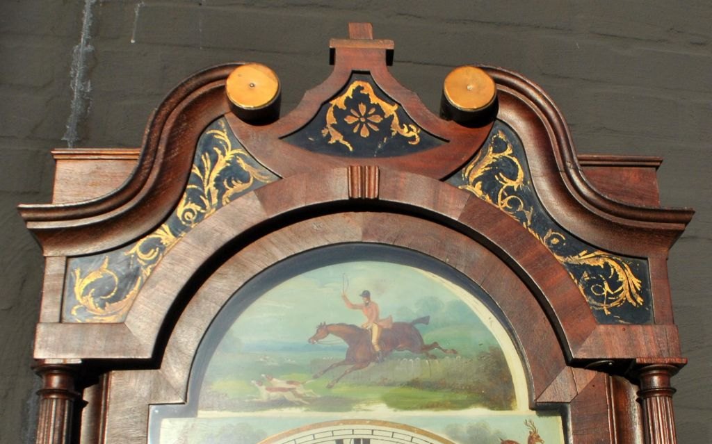 T. Airer, 18. årh. Liverpool, England: Louis XVI standur. Mahogni med kvartsøjler og svanetop. Bemalet urskive med jagtscene og dyr. Øverst bemalede glas. H.: 225 cm. B.: 55 cm. D.: 25 cm.Emne nummer: 28860