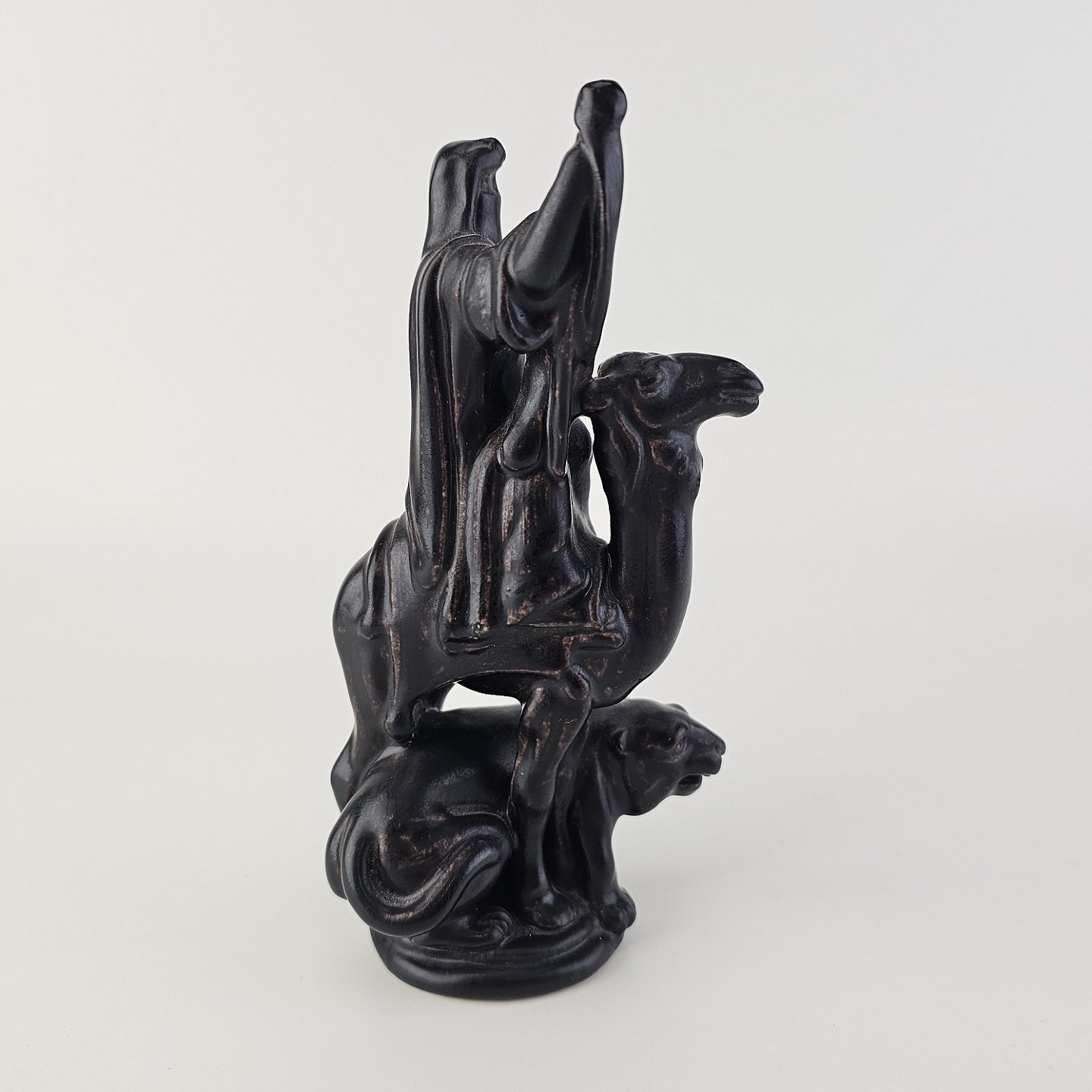 Meget sjælden figur i porcelæn fra et sæt skakbrikker med motiver af Richard Løvehjertes tempelriddere og Saladins saracenere. Denne figur er dronningen fra saracenerne og har motiv af en kvinde iklædt slør på en kamelFormgiver Kai Nielsen