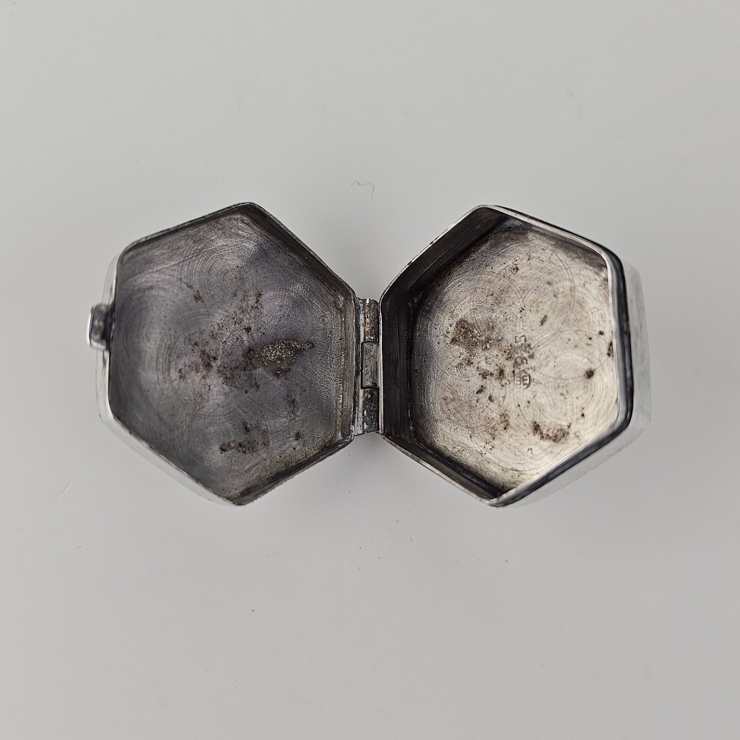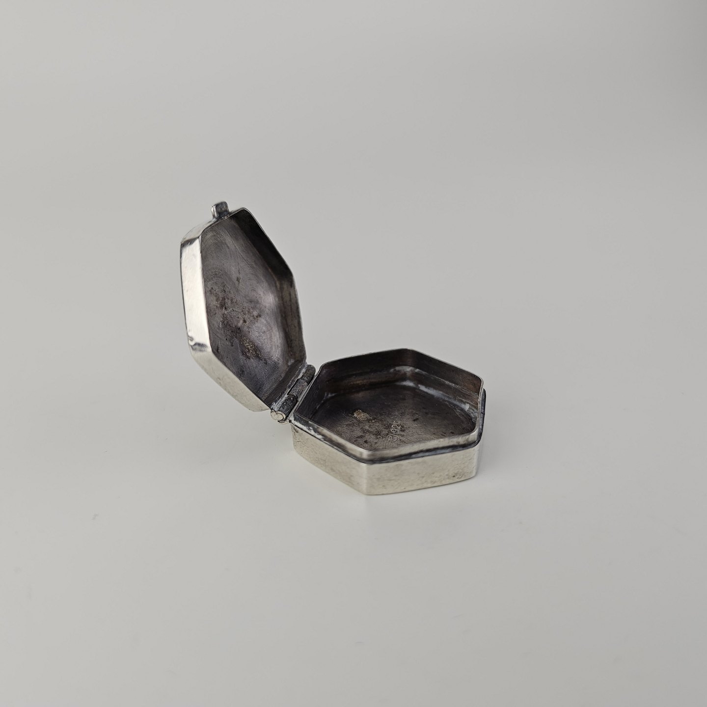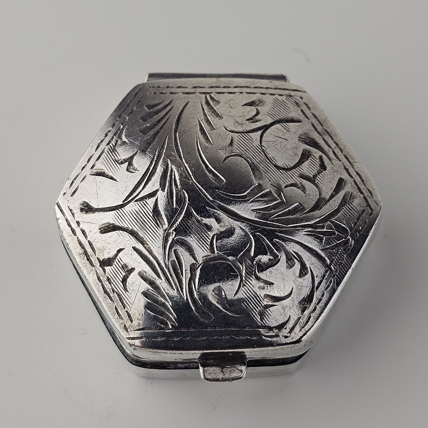 Sekskantet pilleæske i sterling sølv med indgraveret bladmotivStemplet 925