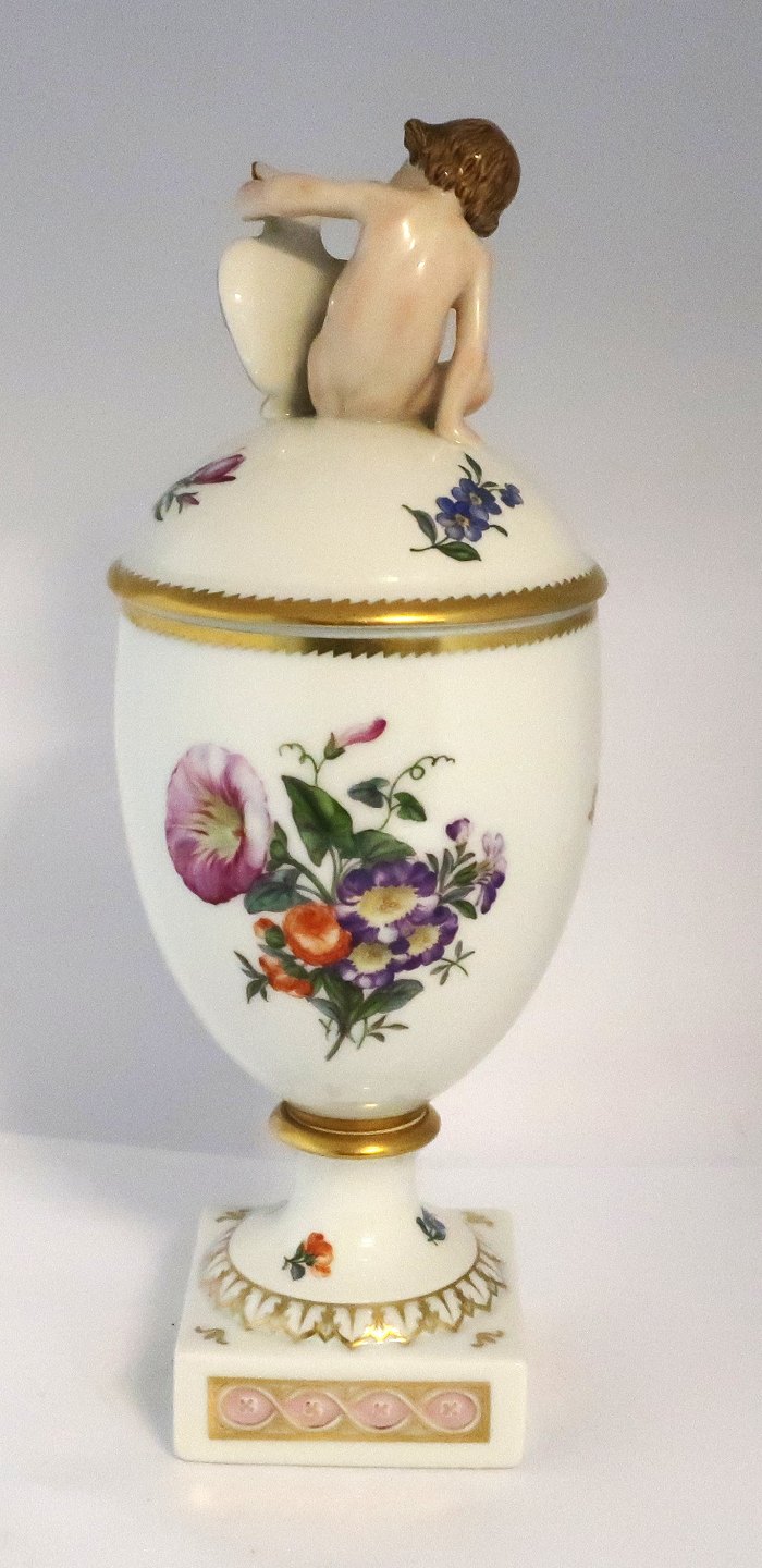 Royal Copenhagen. Saksisk blomst. Lågpokal med putti på låget. Model 1754. Højde 30 cm (1 sortering) Udstiller