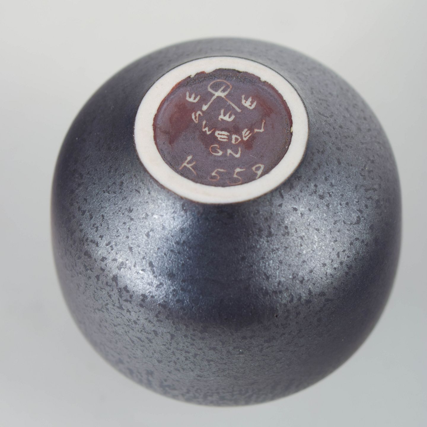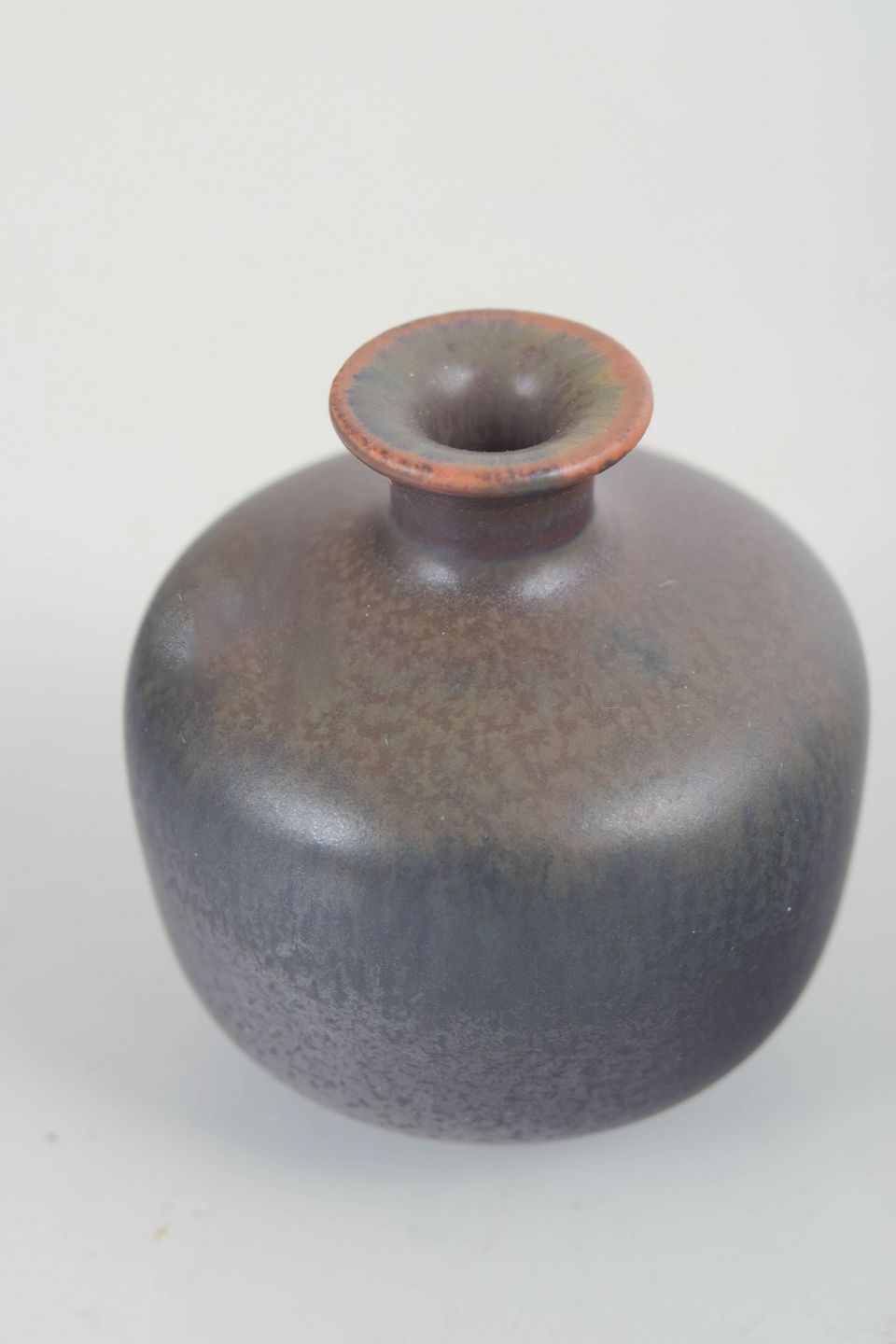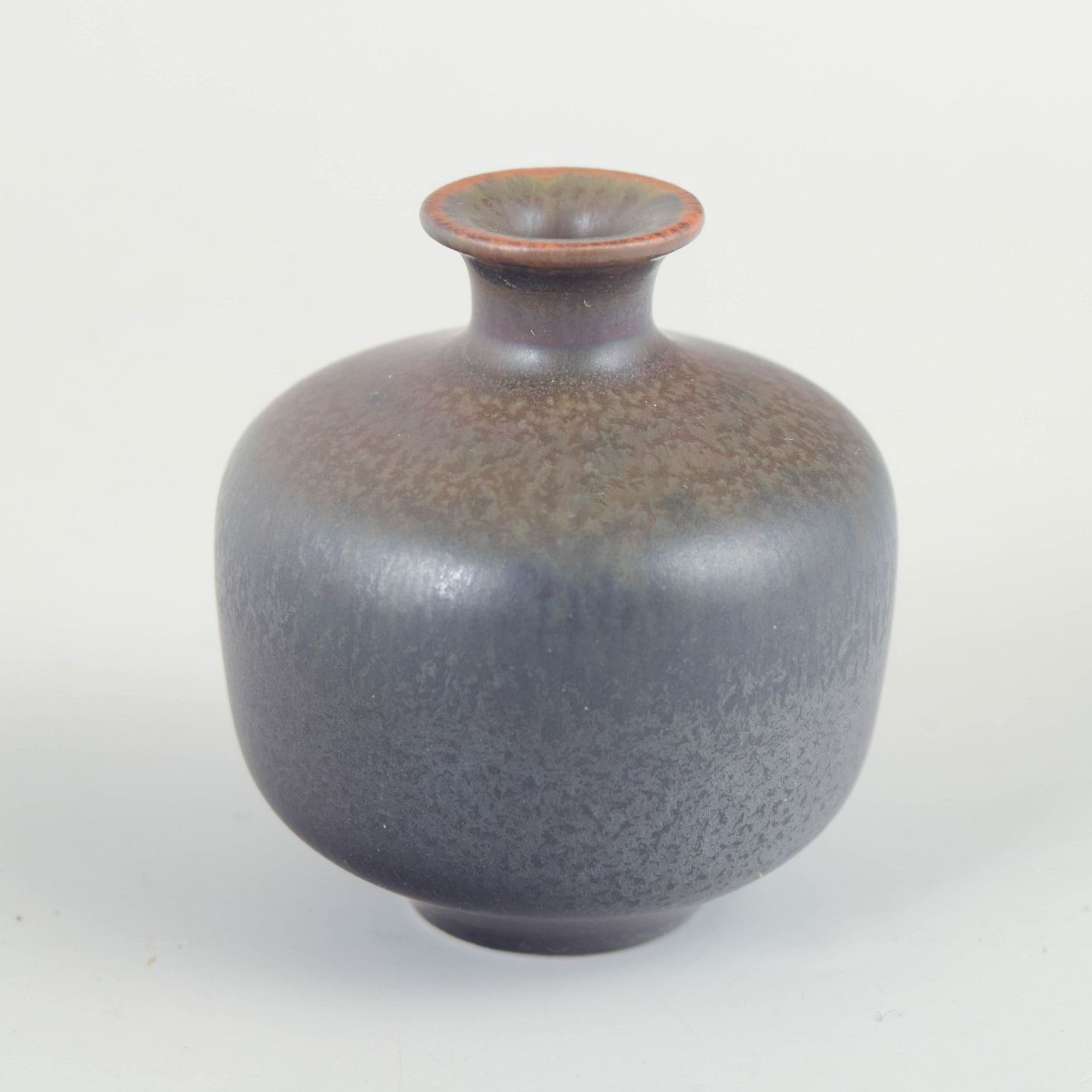 Gunnar Nylund for Rörstrand, miniaturevase.Kompakt miniaturevase i drejet stentøj med afrundet korpus og smal hals, udført med finspættet mat glasur i mørke gråbrune nuancer. Model 559, 1. sortering.