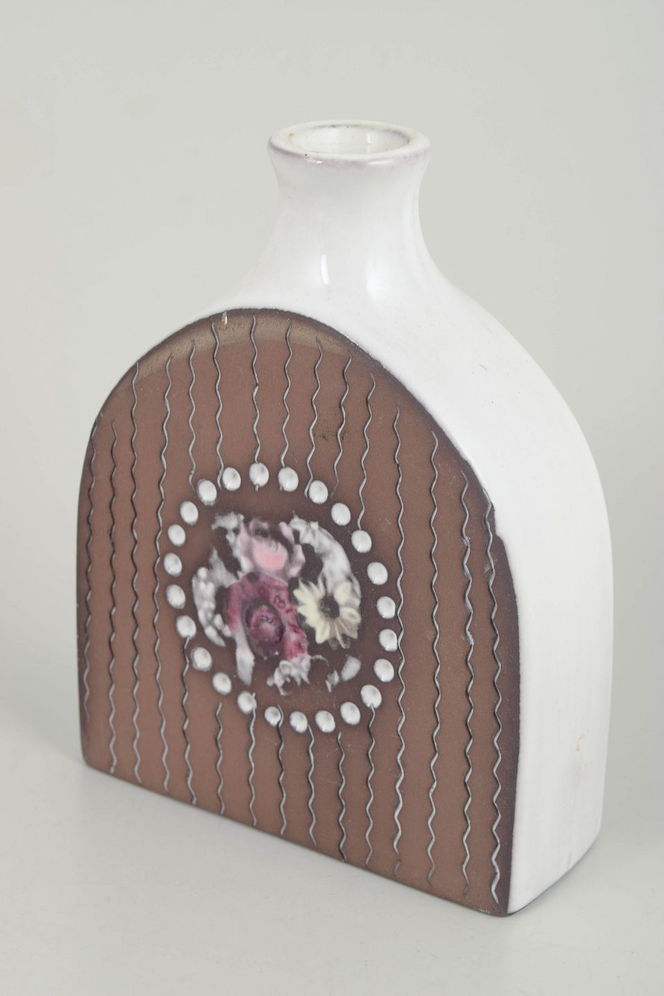 Mari Simmulson for Upsala Ekeby, vase.Figurativ vase med stiliseret kvindeportræt dekoreret med blomster og geometriske ornamenter i relief og farvet glasur.