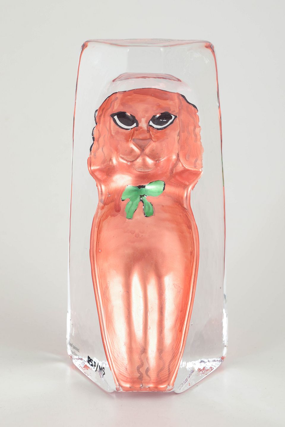 Renate Stock-Paulsson for Kosta Boda / Sea Glasbruk, hundefigur.Mundblæst glasfigur i klart glas med indkapslet rosa hundemotiv, håndmalede detaljer og model udført i reliefform inde i glasset.