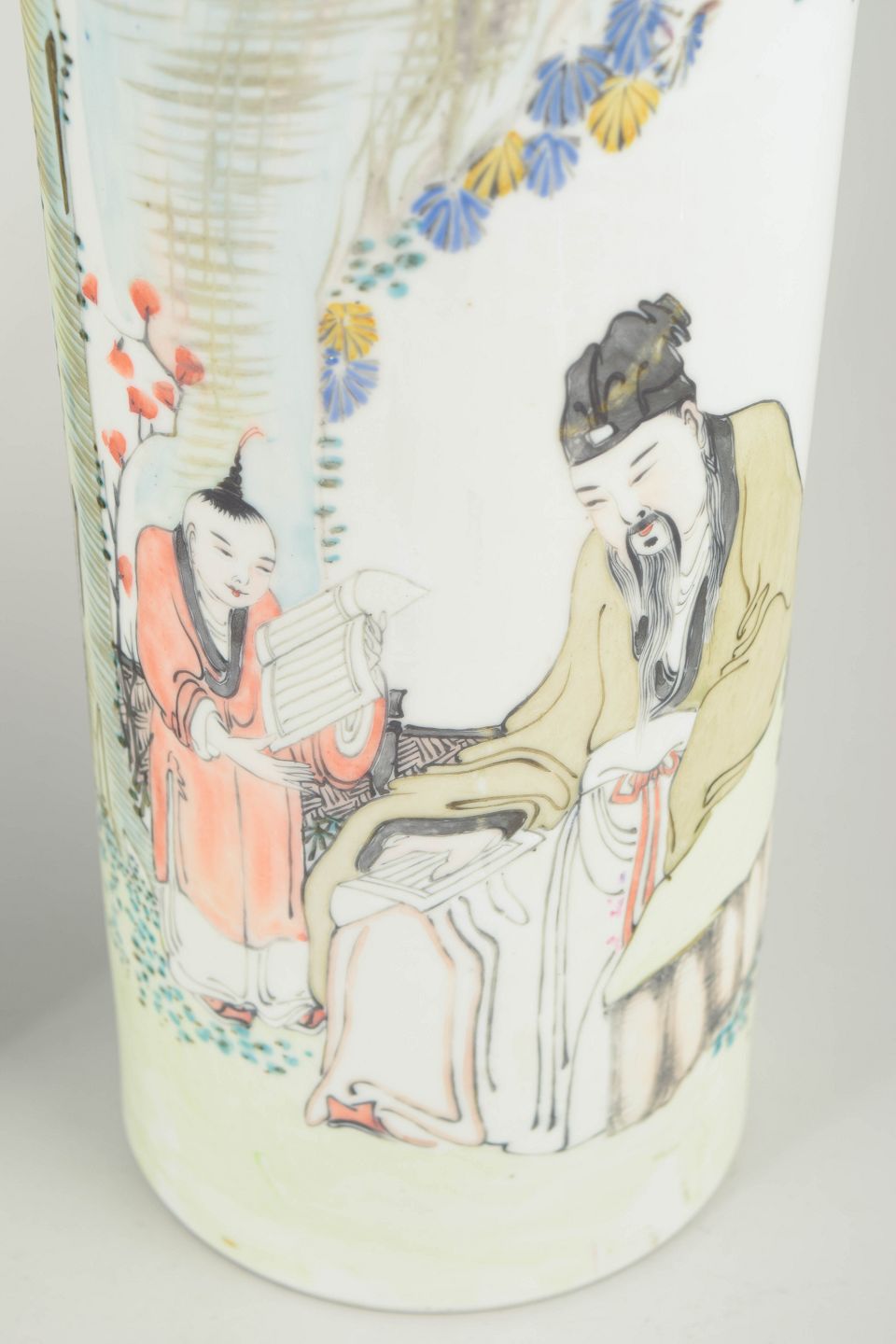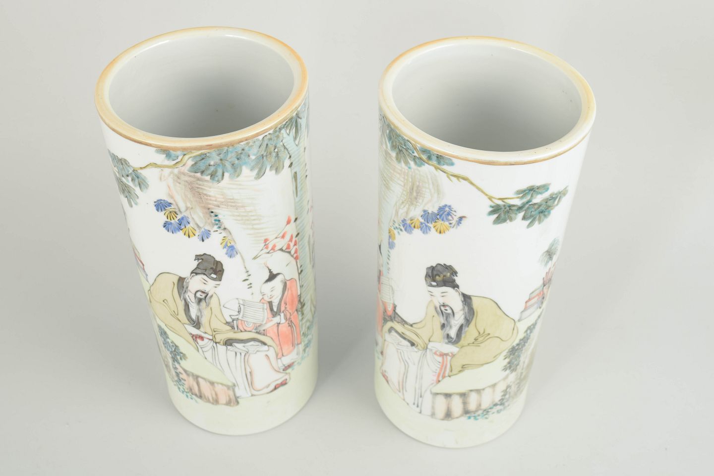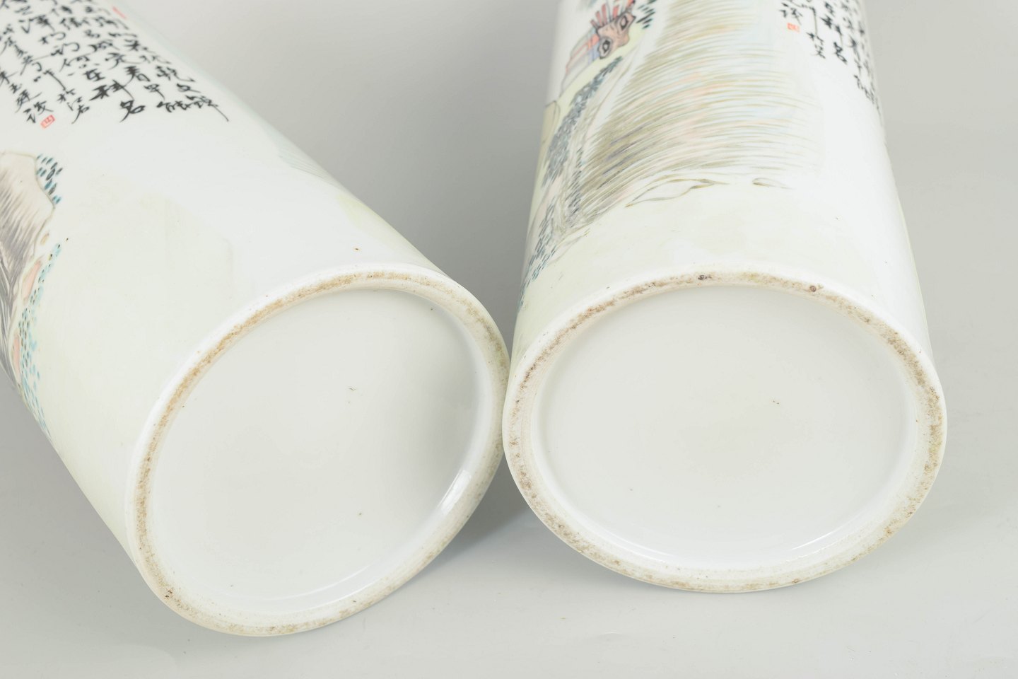 Kinesisk porcelæn, par vaser .Par cylindriske vaser i porcelæn, hånddekoreret med figurscener i emaljefarver samt kalligrafi og segl. Den kalligrafiske tekst kan oversættes til: “Blomsternes duft er ren og vidtrækkende; de elegante blomster afspejler en forfinet smag og udtrykker ro, harmoni og samklang mellem natur og menneske.”