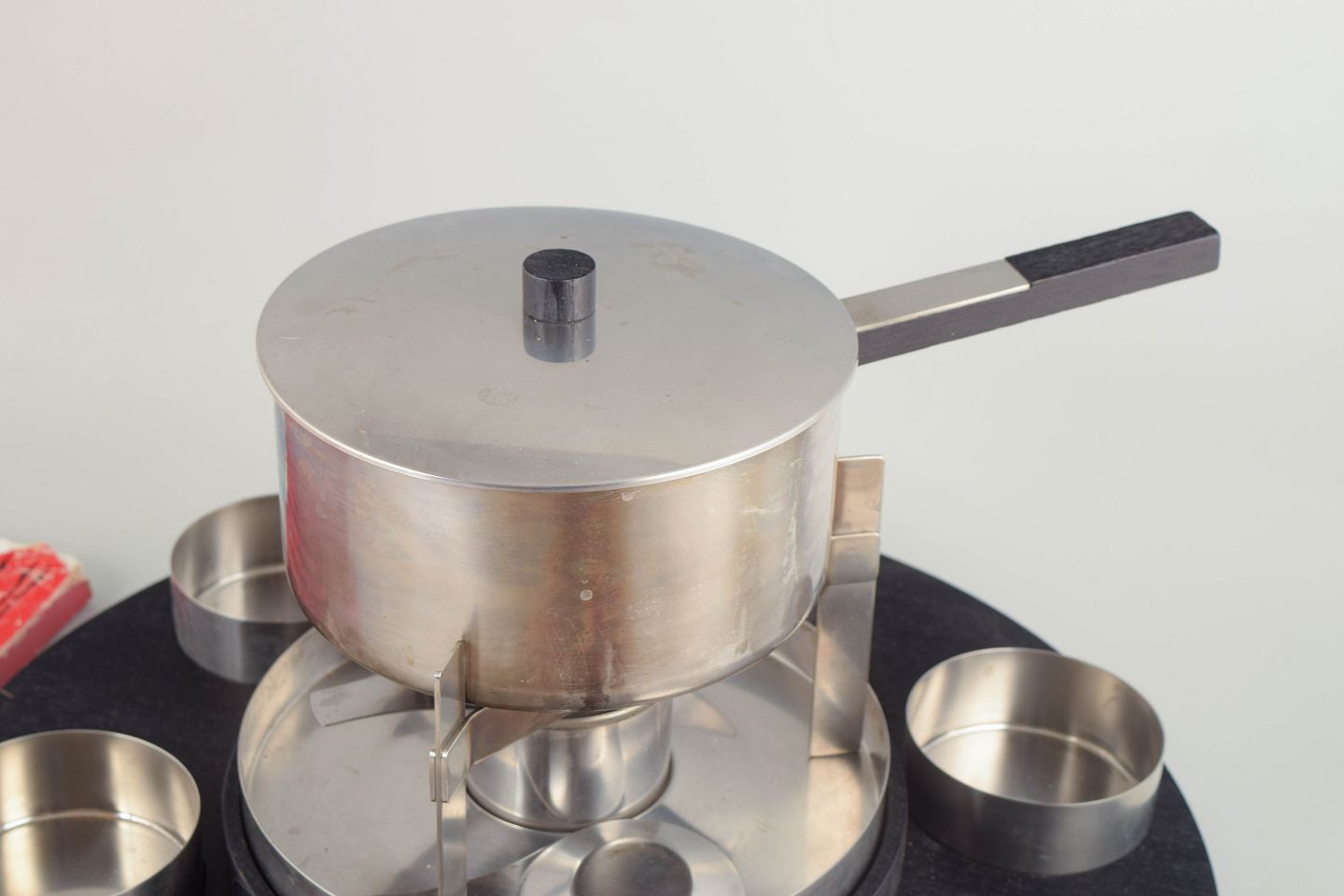 Arne Jacobsen og Peter Holmblad for Stelton, stort fonduesæt.Stort fonduesæt i rustfrit stål med gryde, brænder, sort sokkel og seks skåle og spyd, udført i et stramt funktionalistisk formsprog.