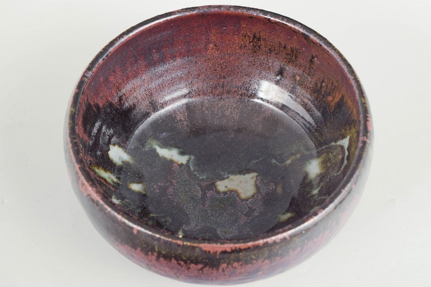 Helle Allpass, unika skål.Unik, drejet skål i stentøj med kraftig, løbende glasur i dybe bordeauxrøde og mørke toner over lys bund, udført som et enkeltstående studiearbejde.