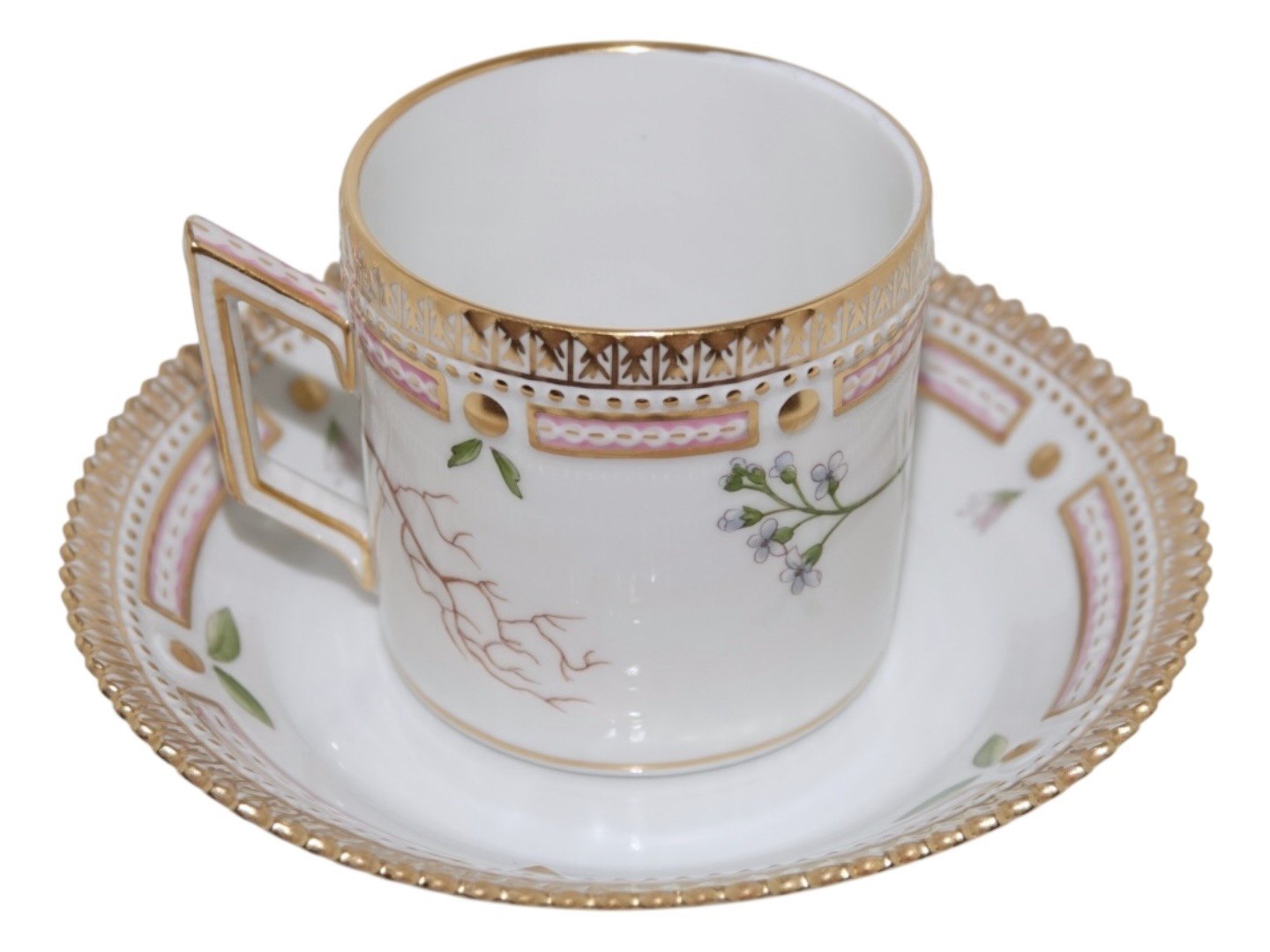 Royal Copenhagen Flora Danica, chokoladekop med tilhørende underkop.Dekoreret med blomst "Cardamine faeroeensis Horn", som er "Færøsk Engkarse" på dansk.