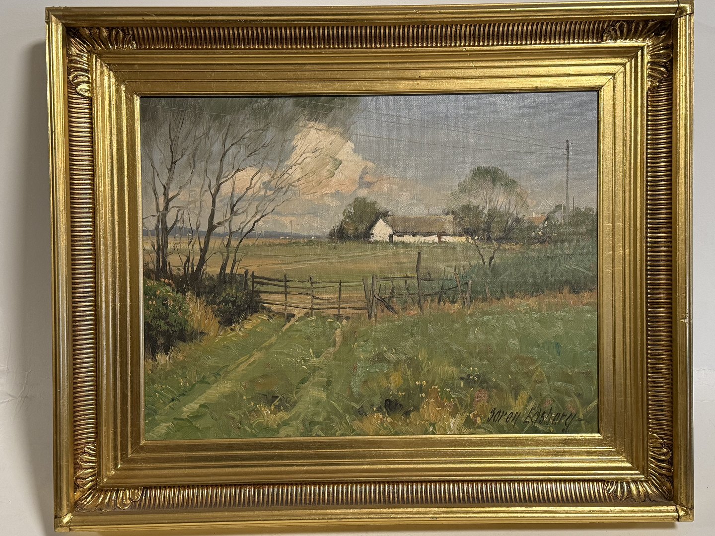 Søren Edsberg (f. 1945 ), Oliemaleri på lærred med motiv fra landet, Mål med ramme: 53x43cm, lille fejl på rammen ellers pæn standLager: 1
