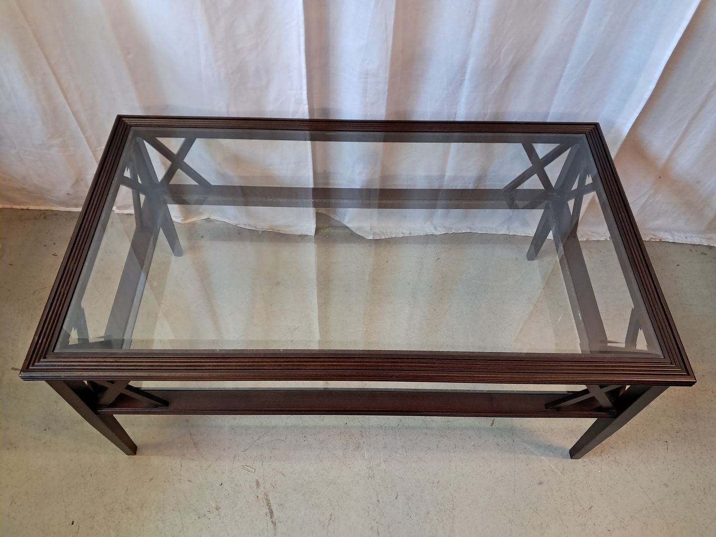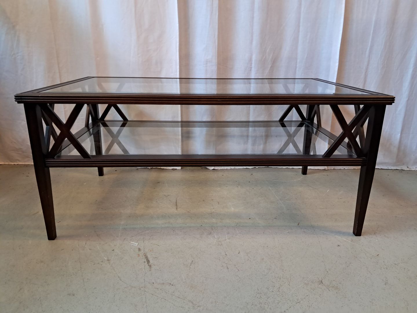 Sofabord i fineret mahogni med 2 glasplader, fra 2000erne.Det har brugsspor.