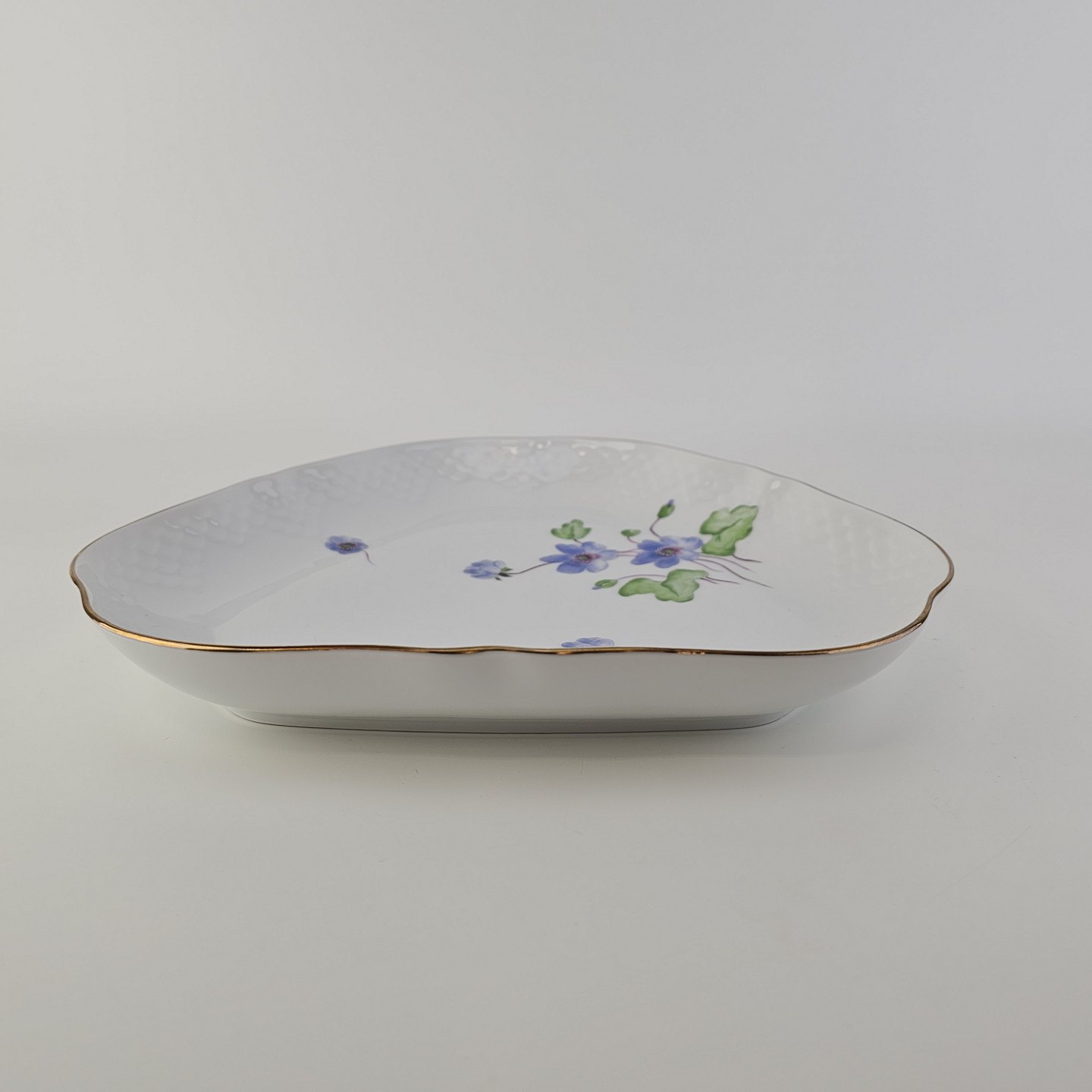 Antonius er af hvidt porcelæn med skælform dekoreret med håndmalede blå anemoner og guldkant. Også kendt under navnet Blå Anemone.