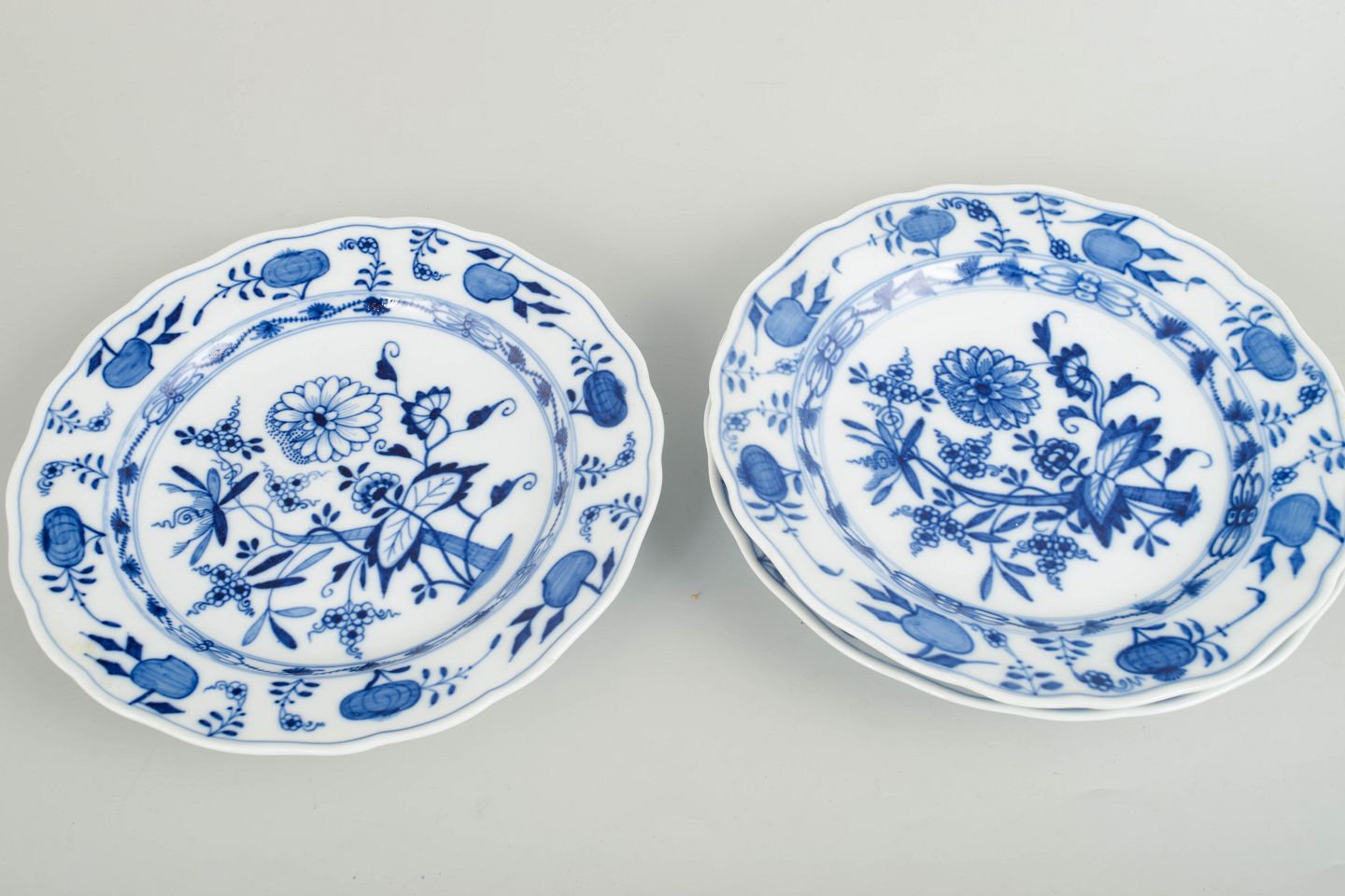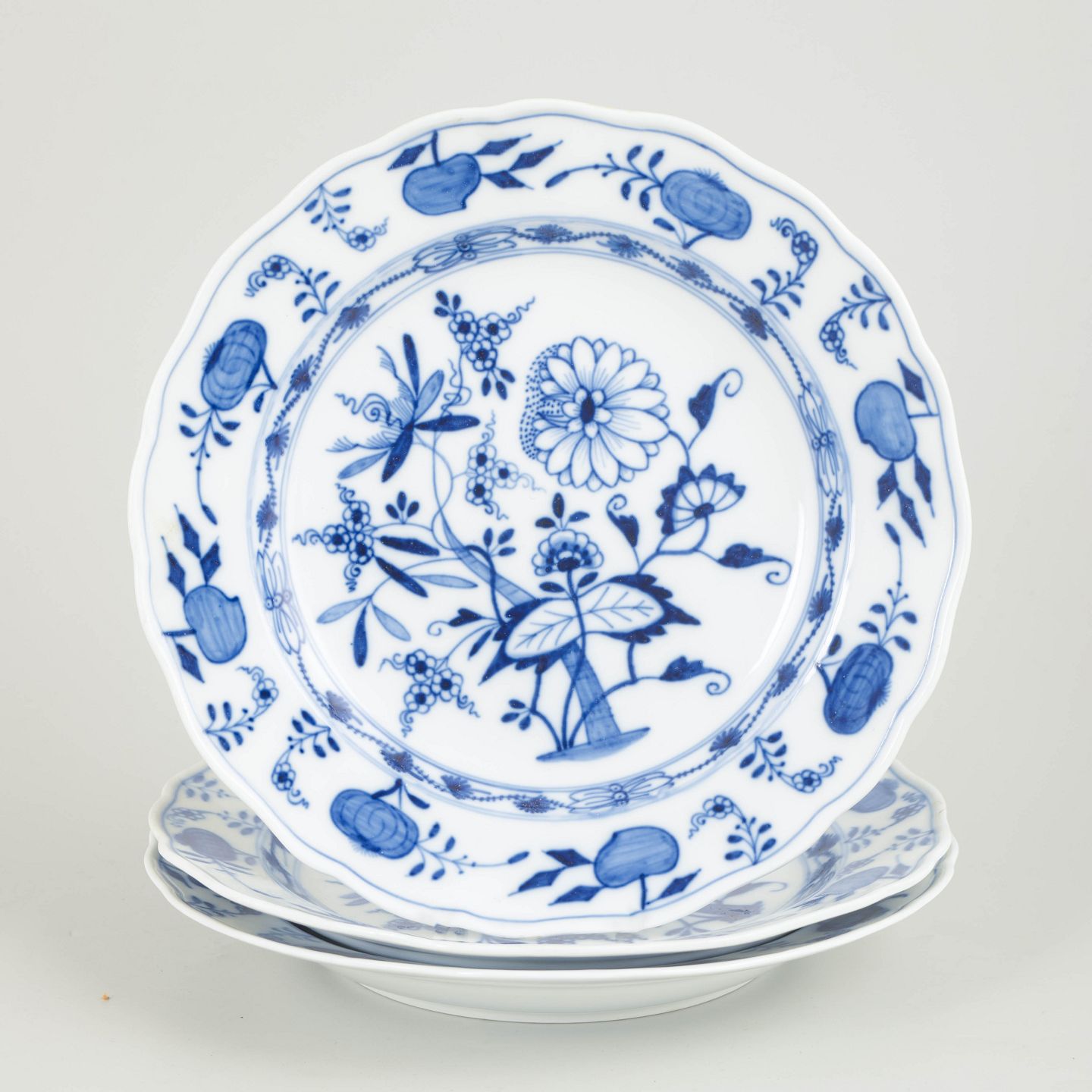 Meissen, løgmønster middagstallerkener, sæt på 3.Middagstallerkener i hvidt porcelæn dekoreret i underglasur løgmønster med bølget fane. Mærket i bunden med Meissens krydsede sværd.