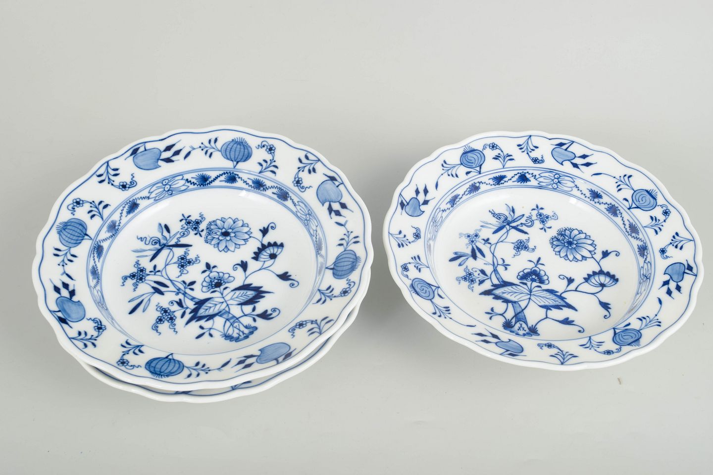 Meissen, løgmønster, dybe tallerkener, sæt på 3.Dybe tallerkener i hvidt porcelæn dekoreret i underglasurblåt løgmønster med bølget fane. Mærket i bunden med Meissens krydsede sværd.