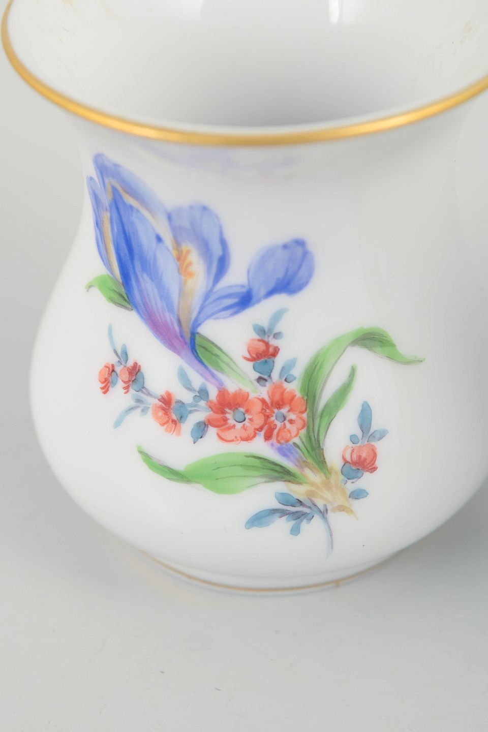 Meissen blev grundlagt i 1710 og er Europas ældste porcelænsmanufaktur. De krydsede sværd, introduceret i 1720’erne, er et af verdens mest kendte porcelænsmærker og fungerer som garanti for oprindelse og kvalitet. I mellemkrigstiden og 1940’erne videreførte Meissens klassiske blomsterdekorationer i miniatureformat, udført med stor teknisk præcision og i tråd med fabrikkens lange tradition for håndmalet porcelæn.