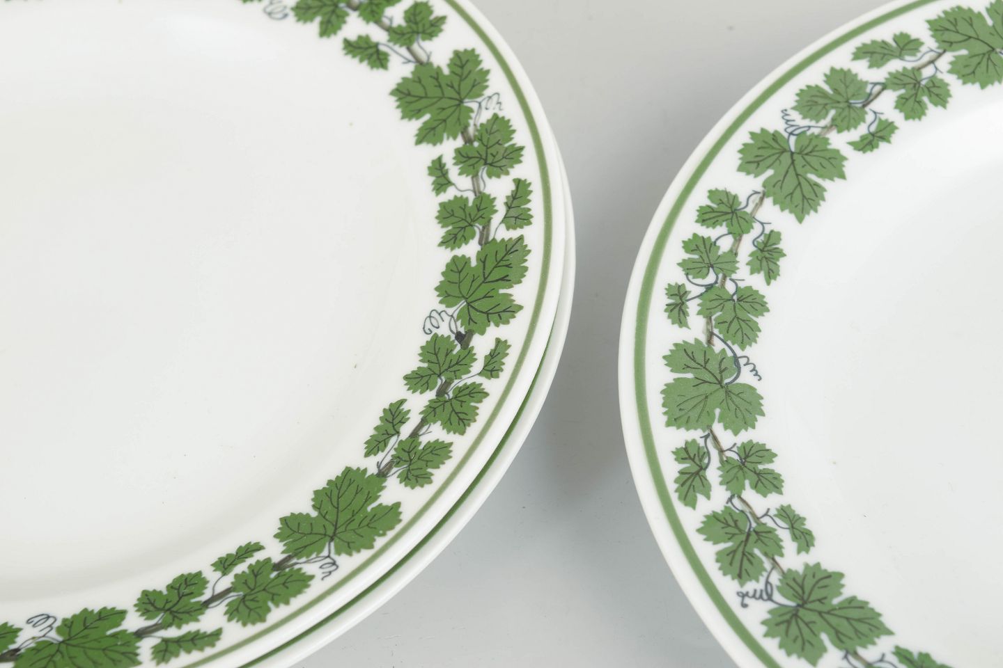Meissen, Vinløv, sæt på 3 tallerkener.Runde porcelænstallerkener dekoreret med grøn vinløvsbort langs kanten. Første sortering, mærket med Meissen krydsede sværd.